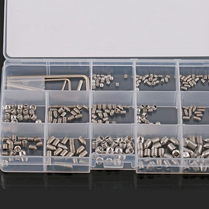 Различные размеры винтов для внешнего кольца с шестигранной головкой, все эти изделия упакованы в удобную пластиковую коробку с регулируемой перегородкой.