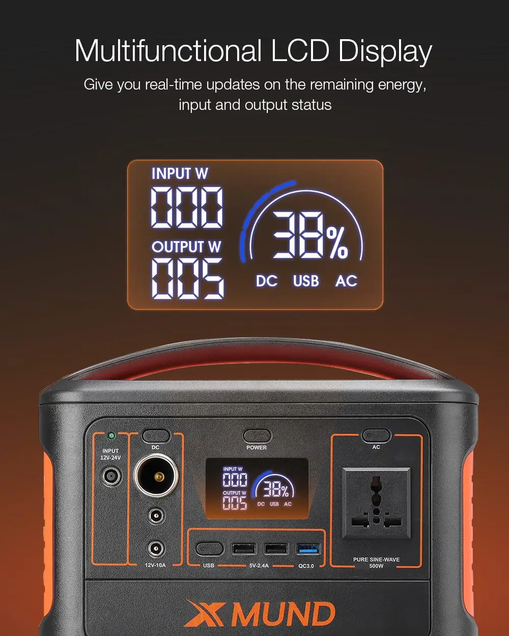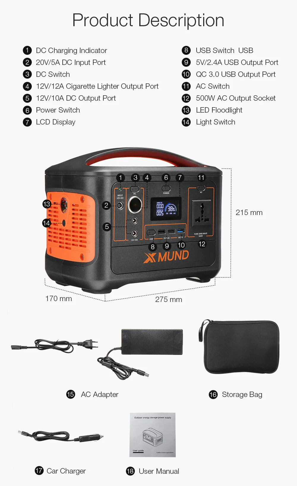-Стабильный выход переменного тока 500 Вт Номинальная мощность, 1000 Вт пиковая мощность.