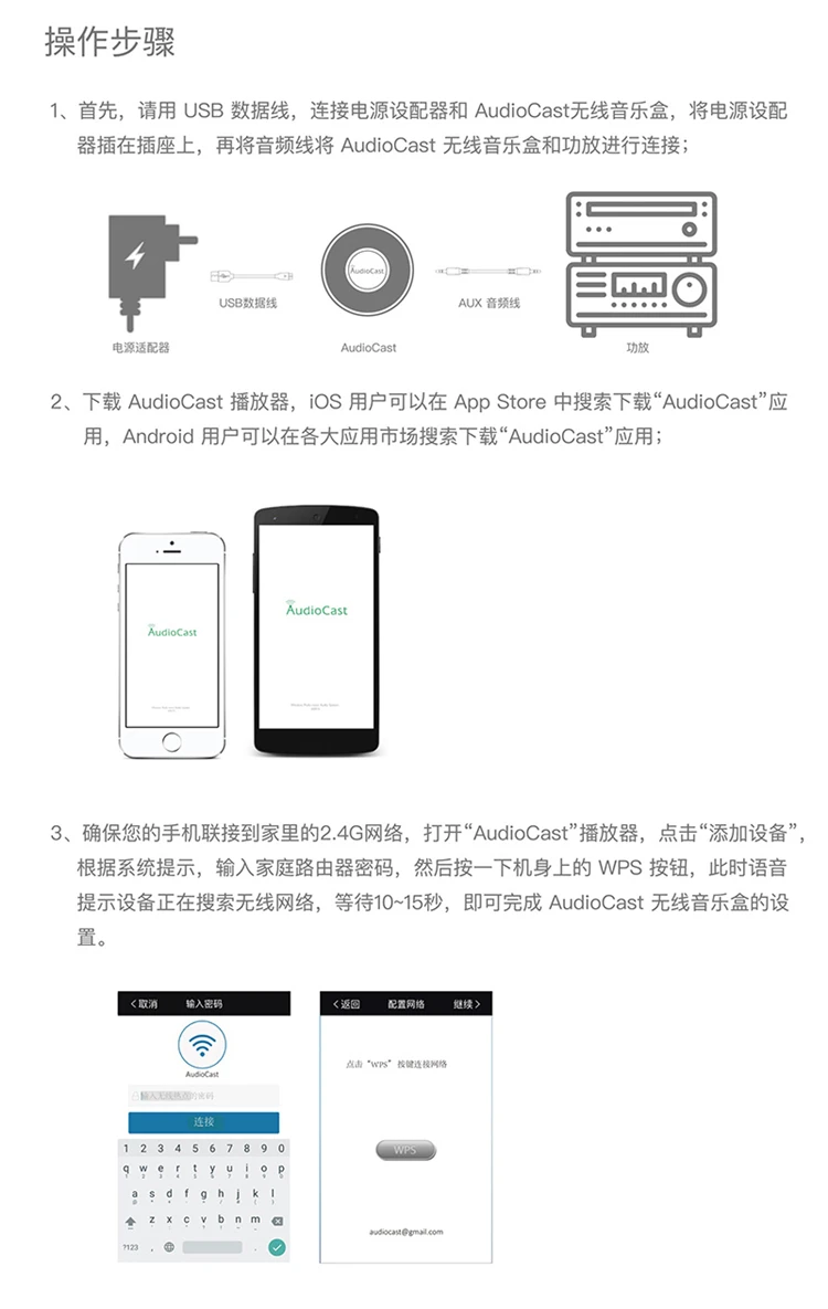 3) Пожалуйста, убедитесь, что ваш мобильный телефон имеет подключен к 2,4 ГГц сети в домашних условиях, откройте «Audiocast» программного обеспечения, нажмите «Добавить устройство»
