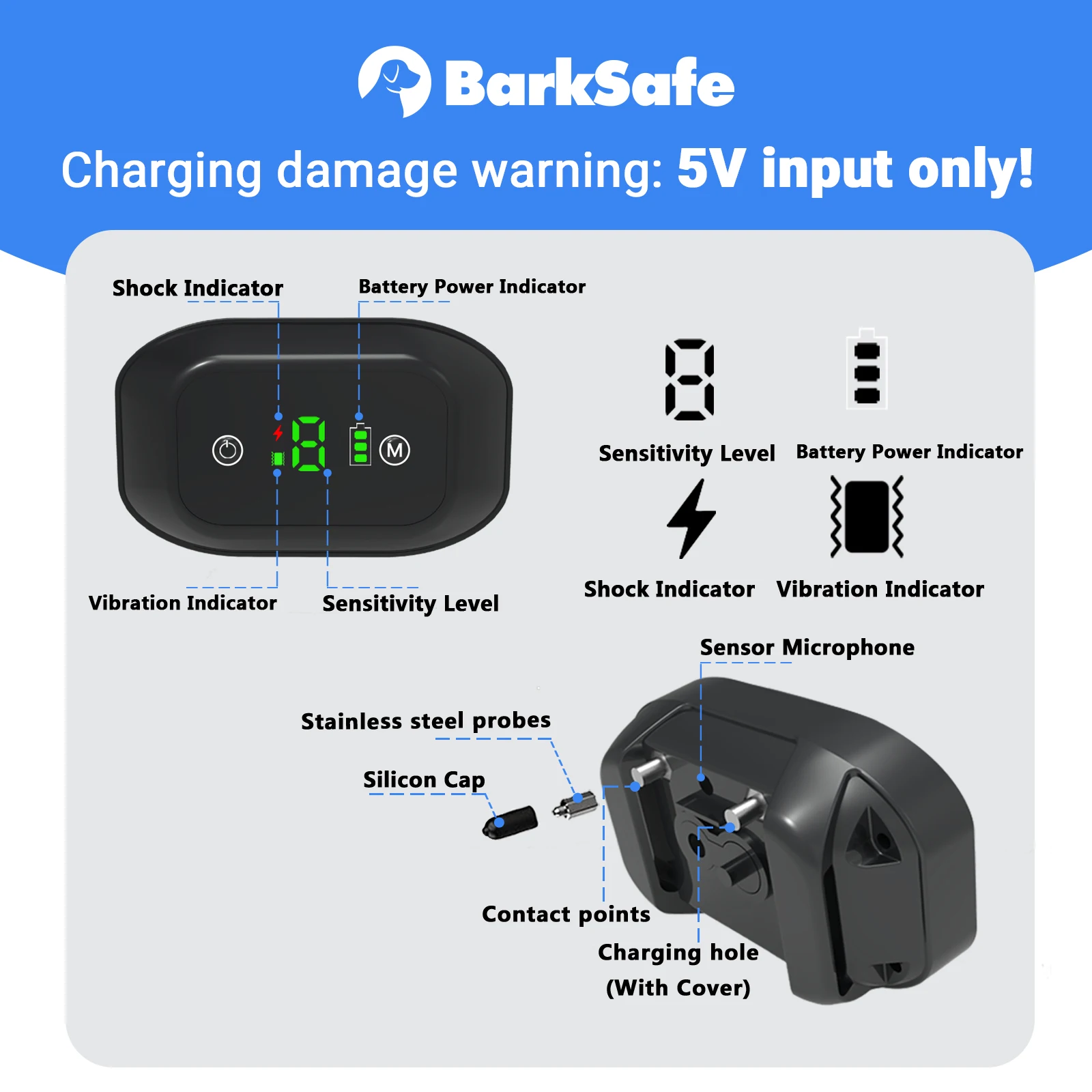 Bark Safe Pro Электрический собачий лай ошейник безопасный водонепроницаемый вибрационный тренировочный ошейник для собак управление 3 режимами анти-лайО характеристиках Bark Safe Pro: Предупреждение/режим вибрации/режим удара-Уровень обучения: 0-5-Водонепроницаемость: IP67-Подходит для пород собак: 10lbs-100lbsПредупреждение/режим вибрации/режим удара/режим non shock Умный и удобный:-Оснащен интеллектуальным датчиком срабатывания, с Умной функцией защиты от помех.-Вибрирующий собачий ошейник активируется только тогда, когда собака лает, и не запускает Никаких ложных триггеров, вызывая дополнительные ненужные неприятности для вас и ваших близкихРабочий процесс воротника:-Включение/выключение питания: удерживайте кнопку чувствительности в течение 3 секунд-Режим переключения одной кнопкой: нажмите кнопку «M», зеленый дисплей в середине экрана-это режим «no shock», нажмите кнопку «M» снова, красный дисплей в середине экрана-это режим удара-Режим Shock: Установите кнопку shock на уровень 1-5. Первое Обнаружение собачьего лая 1 секунда и 1, во-вторых, второй и третий обнаружения-вибрации в течение 1 секунды, поражения электрическим током для 0,5 секунд.-После полной зарядки с аккумулятором 300 мАч ошейник используется для работы до 15 дней-Ошейник заряжается через USB 5 В/2 А Упаковочный лист:-1 * контроллер с защитой от кора (с регулируемым нейлоновым ремешком)-2 * Проводящий зонд-2 * Проводящий силиконовый рукав-1 * испытательный светильник-1 * USB кабель для зарядки-1 * Руководство по эксплуатации
