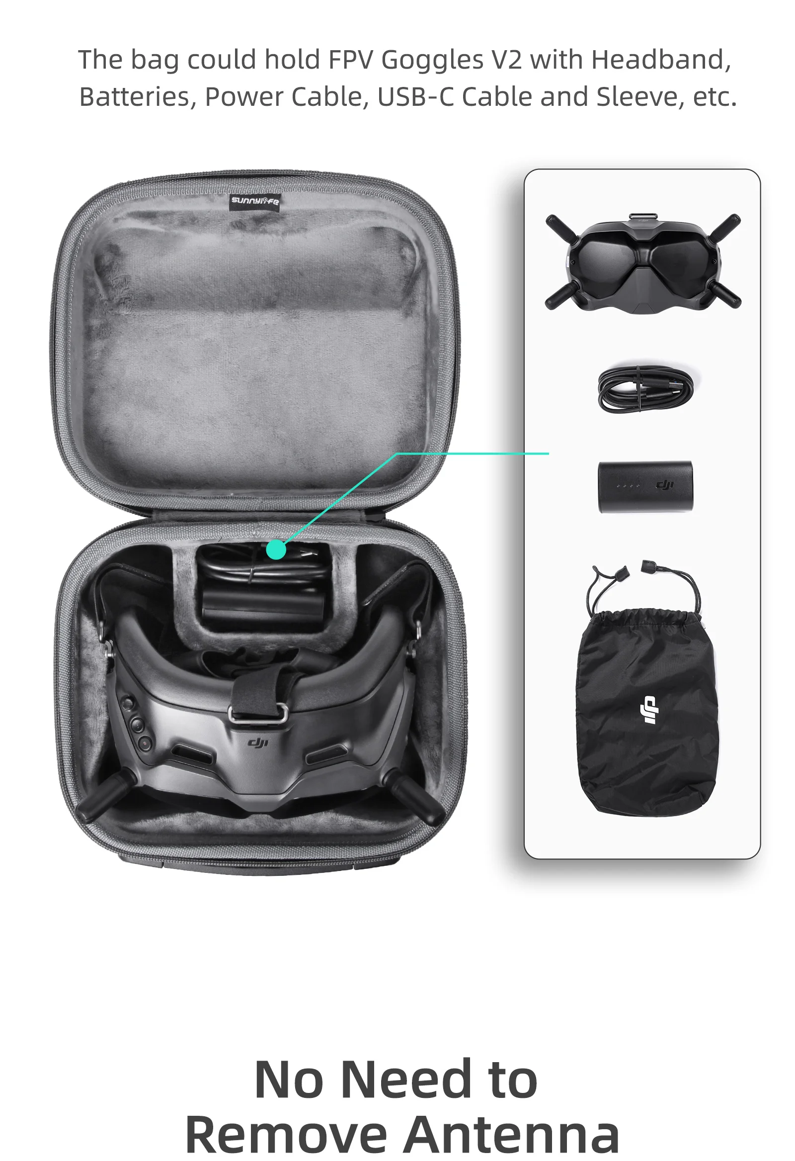 -Он может хранить очки FPV V2 (включая повязку), батарею, шнур питания, USB-C кабель для передачи данных, сумку на шнурке и т. д.