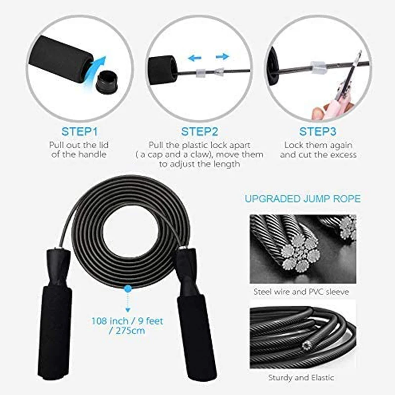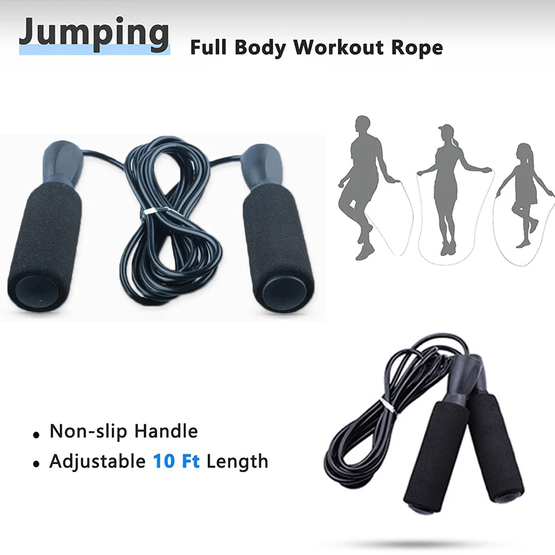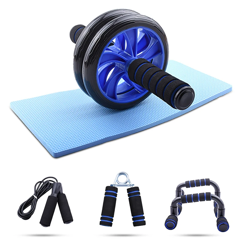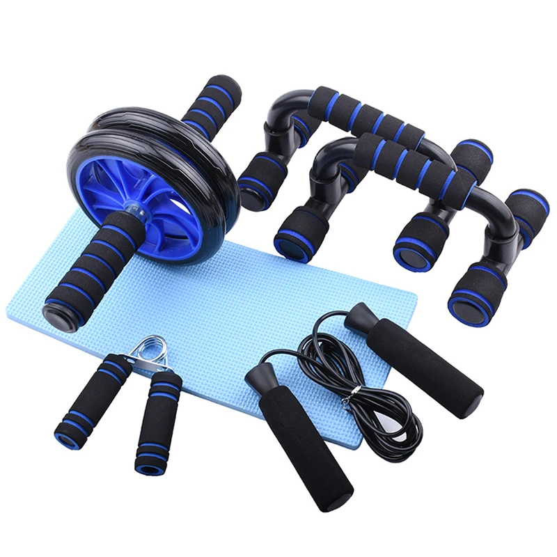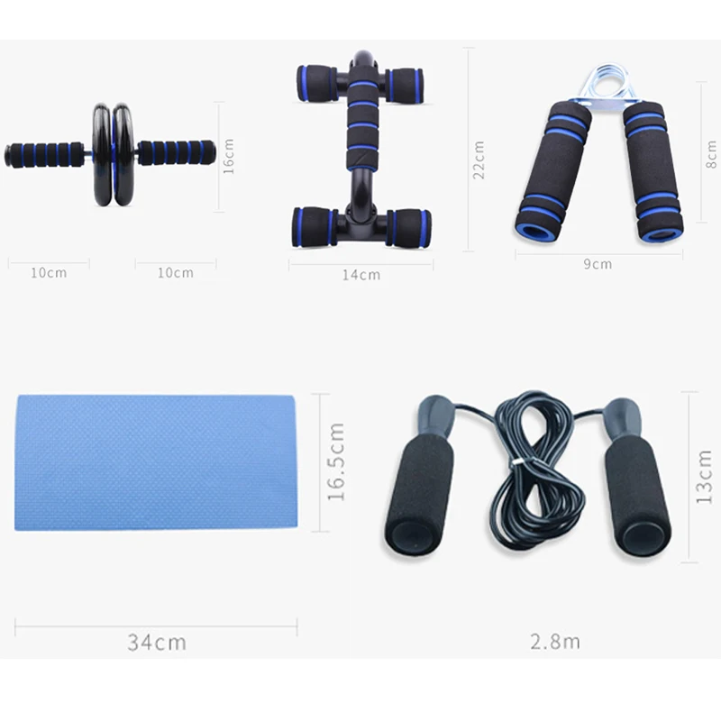 【 5 в 1 KIT】 это 5 в 1 Домашнее тренировочное оборудование, которое включает в себя регулируемые скакалки, ручные захваты, толкатель вверх, AB ролик с наколенниками.