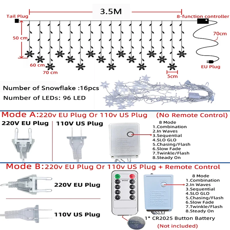 Режим A: 220 В штепсельная вилка европейского стандарта или 110 В штепсельная вилка американского стандарта (Без пульта дистанционного управления)Режим B: 220 В ЕС штекер или 110 В, штепсельная вилка стандарта США + пульт дистанционного управления УправлениеМодель батареи дистанционного управления: 1 * CR2025 кнопочный аккумулятор (Не входит в комплект)