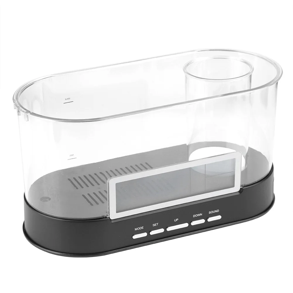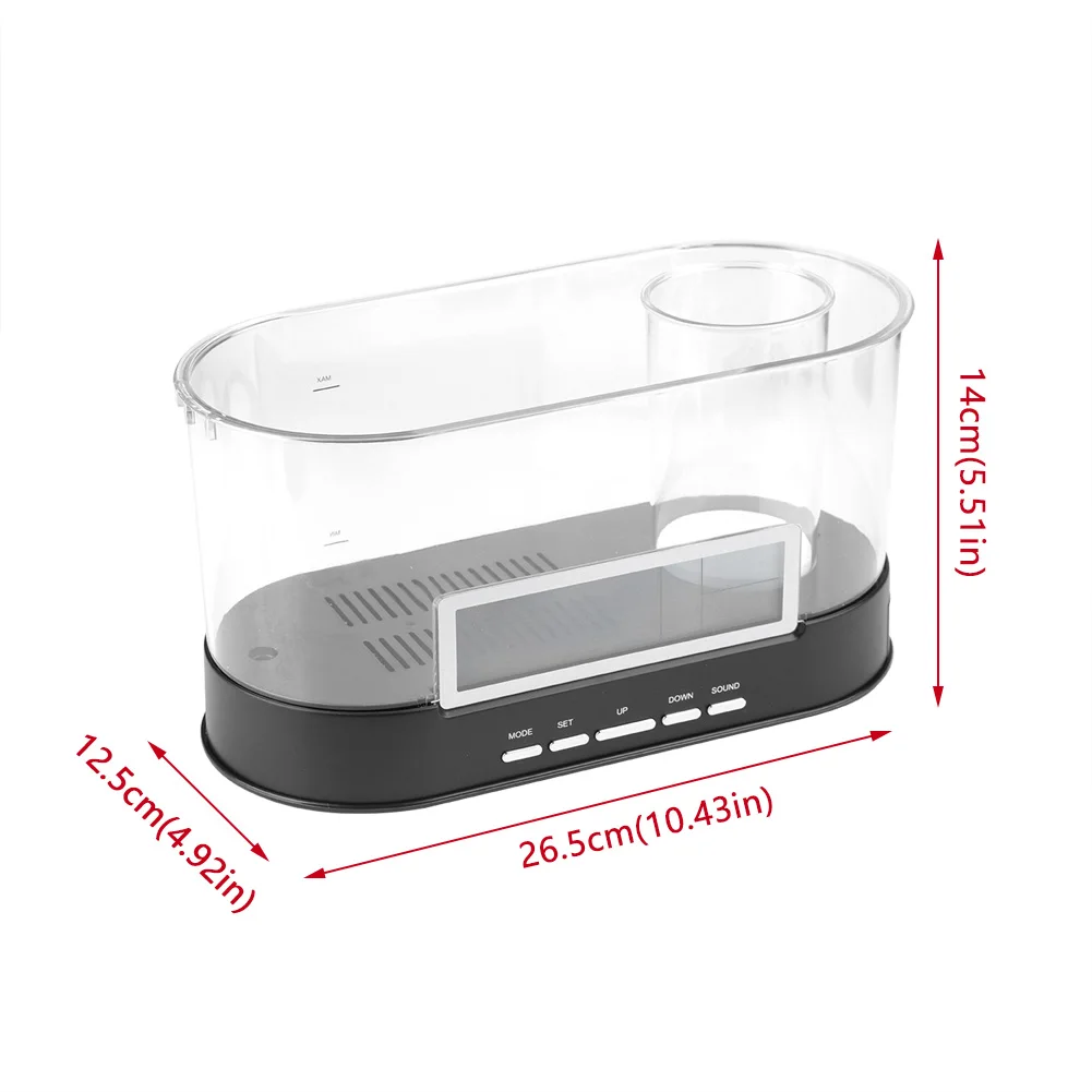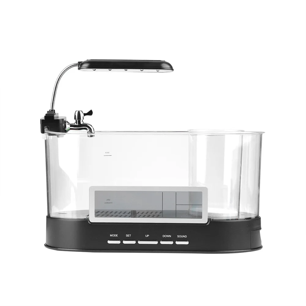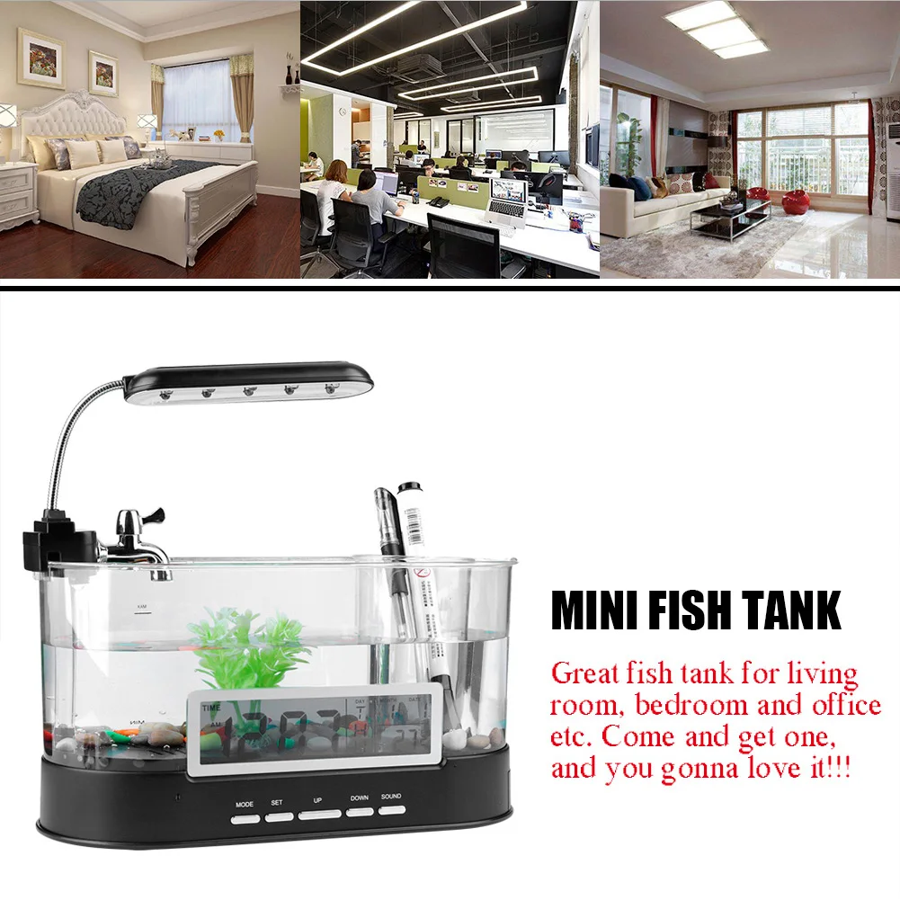 Изготовлен из высококачественного пластика, безопасный и прочный.Элегантный цвет и стильный дизайн делают его отличным декором.Поставляется с красочным Светодиодный светильник, отличное освещение для аквариума.С ЖК-цифровым дисплеем вы можете четко видеть время, дату и температуру.Может также воспроизводить музыку для вас.Поставляется с небольшим ящиком в нижней части и прозрачным контейнером для ручек, поэтому вы можете хранить некоторые мелкие предметы, такие как ключи и ручки.Отличный аквариум для гостиной, спальни и офиса и т. д.Спецификация:
