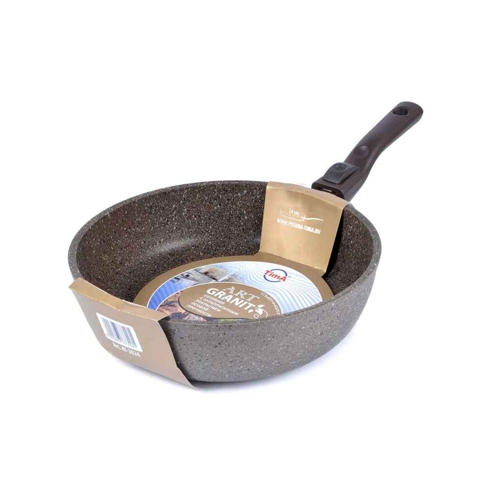 Сковорода TimA "Art Granit" изготовлена из алюминия с антипригарным покрытием. Семислойное сверхпрочное антипригарное покрытие нового поколения серии Art Granit состоит из нескольких слоев каменной крошки с высоким содержанием минералов. Это обеспечивает максимальный антипригарный эффект для приготовления блюд любой сложности и устойчивость к царапинам и истиранию. В процессе приготовления пищи возможно использование металлических столовых приборов.