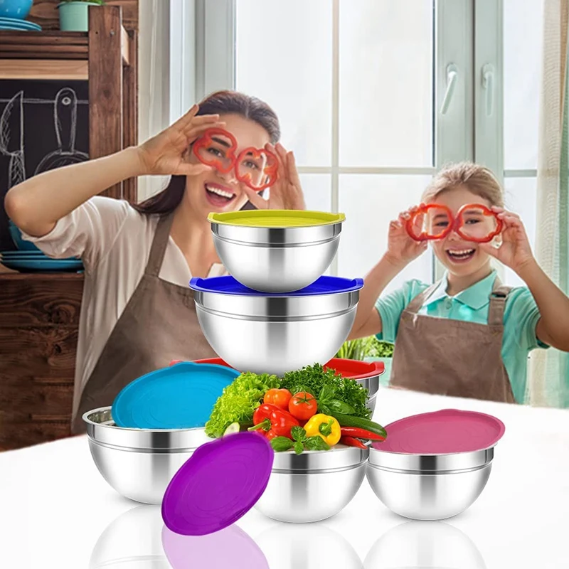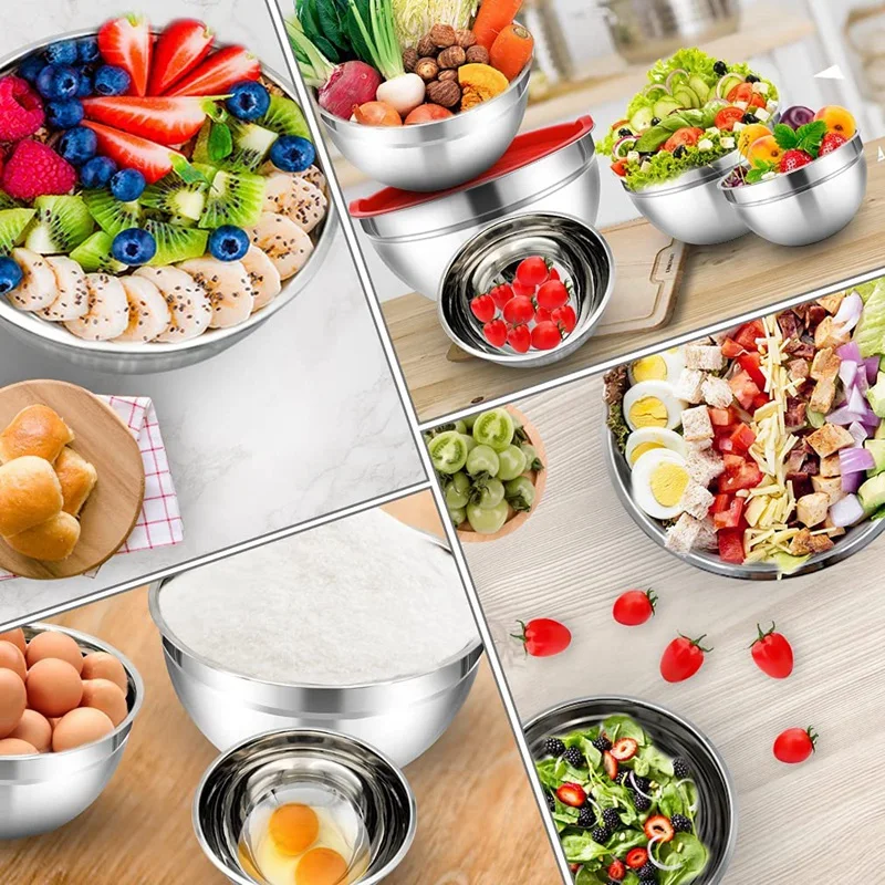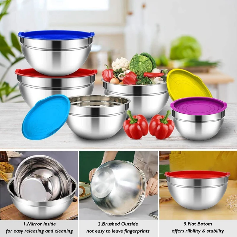 [Многофункциональные миски] миска для смешивания из нержавеющей стали важна для ваших повседневных потребностей кухни. Префект для смешивания, бросания салатов, перемешивания, взбивания, разминания теста, маринования и хранения. После использования просто чистить вручную и в посудомоечной машине. Для герметичности крышки, пожалуйста, Стирайте крышки вручную.