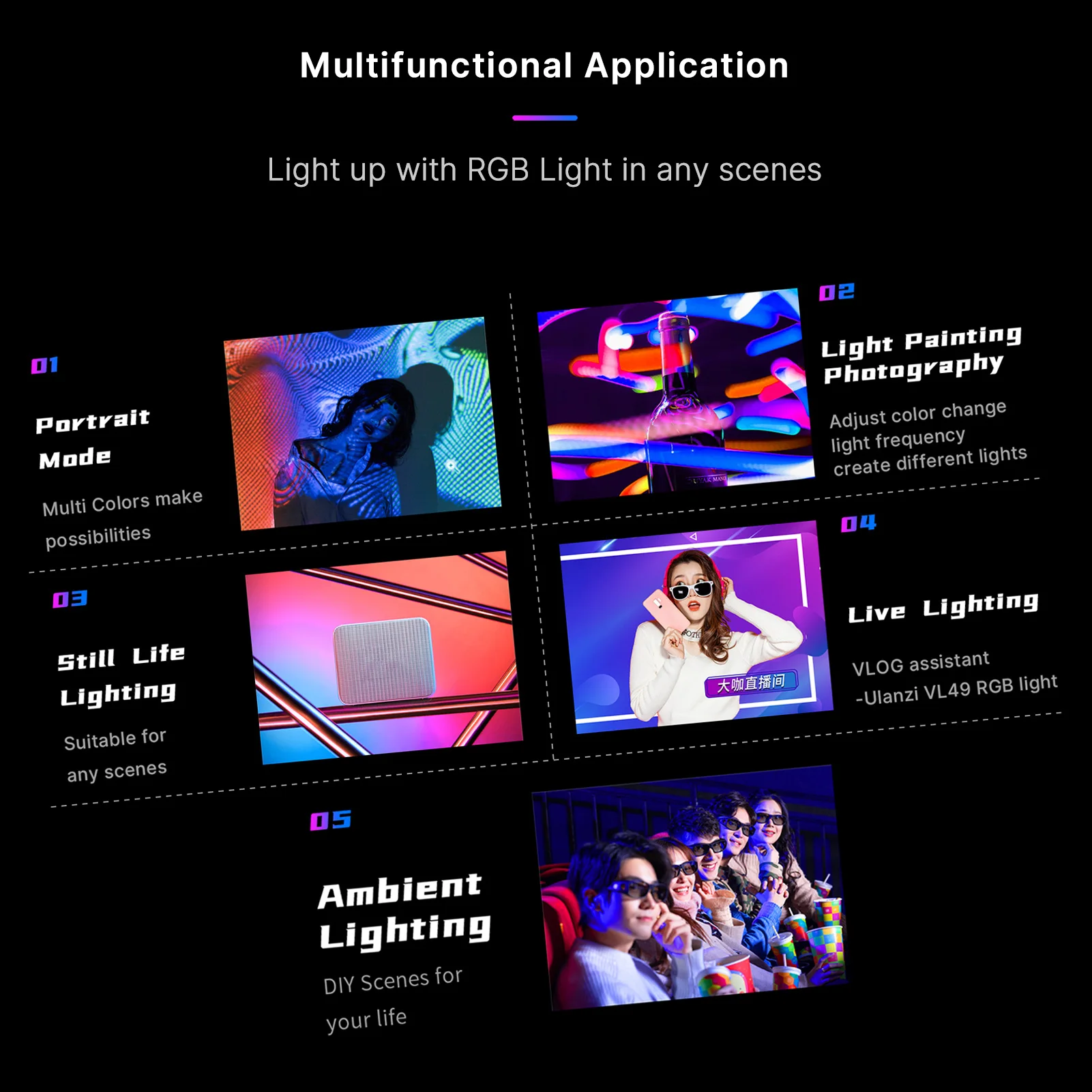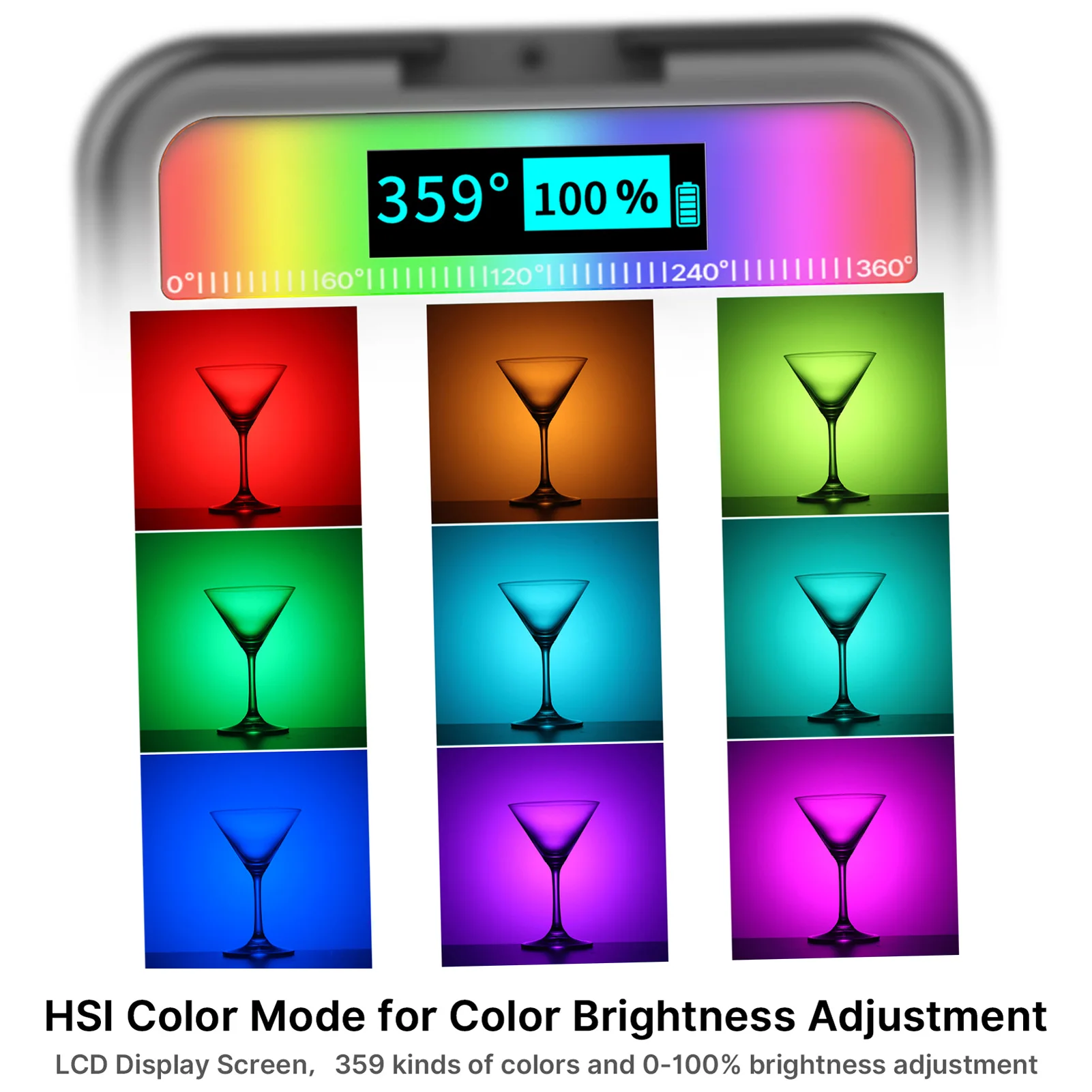Режим цветного светильник RGB: 359 видов цветов и 0%-100% Регулируемая яркость подходят для различных сцен фотографии. Перейдите, чтобы найти красочный мир с этой RGB светильник.