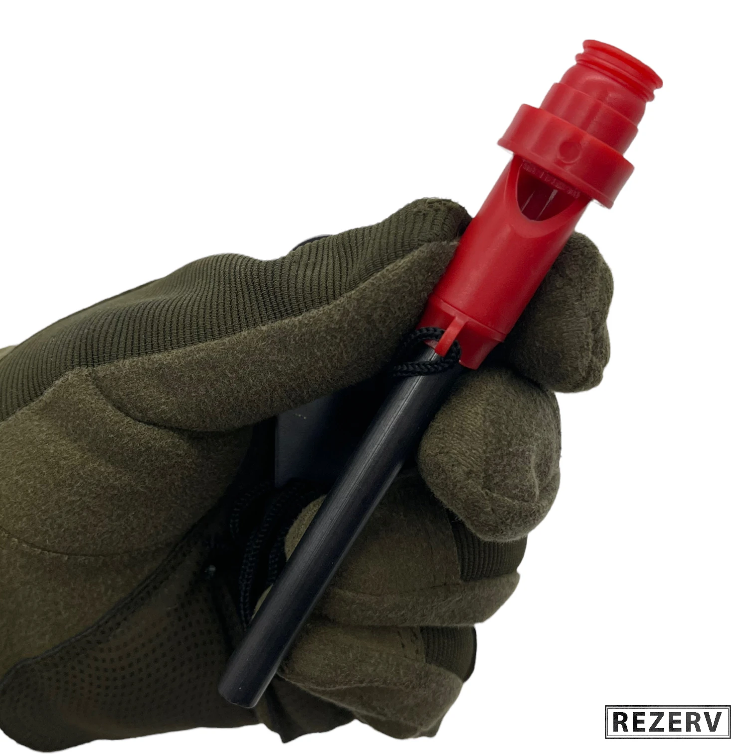 Присутствует свисток, для подачи звуковых сигналов, а красный цвет позволит не потерять огниво, даже в высокой траве.