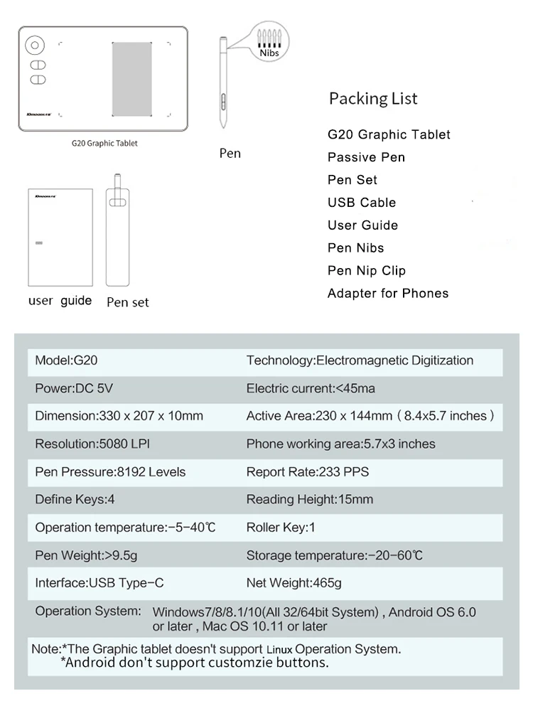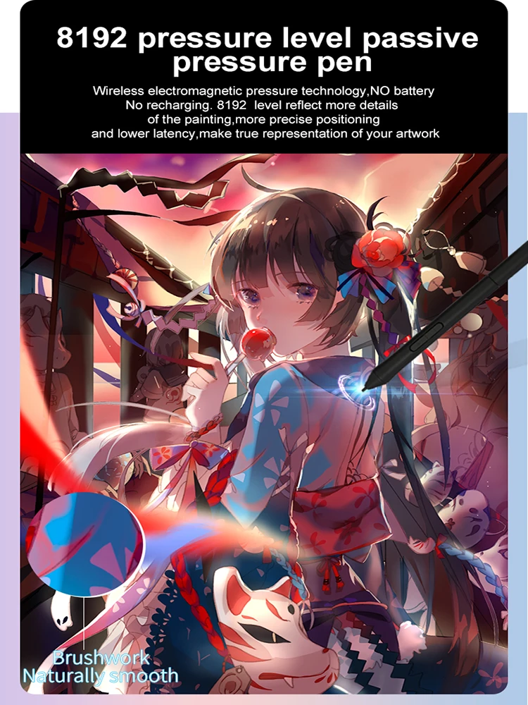 8192 Levels Pressure & 233PPS Report Rate: 8192 levels pen pressure can allow you to draw and design more naturally; 10moons G20 is equipped with a passive pen and does not need to be charged; 233 PPS report rate can instantly identify your painting trajectory.