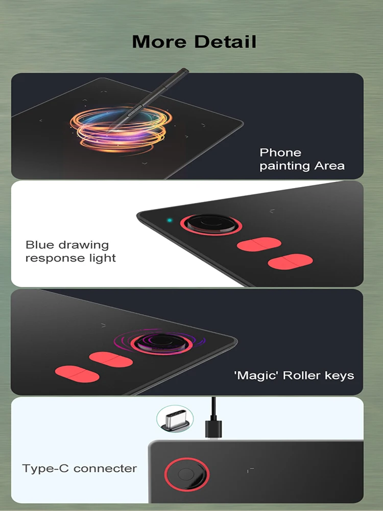 Magic Scroll Wheel & 4 Shortcut Keys: There is a magic scroll wheel on the 10moons G20 tablet. The default function is to zoom in or zoom out the canvas, but you can set the function according to your habits in the driver; The 4 shortcut keys are also customizable , Thereby saving your time and improving work/study efficiency.