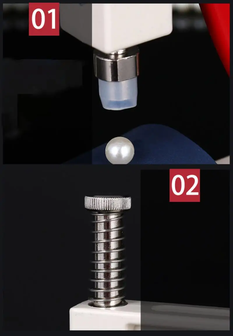 【 Простой в использовании и эксплуатации шаг 】 --- Установите верхнюю форму и жемчуг соответствующего размера, а затем закрепите заклепку на нижней форме пинцетом. Закрепите заклепки и жемчуг на одежде, а затем плотно прижмите ручку, пока заклепки не закрепятся на Жемчужине.