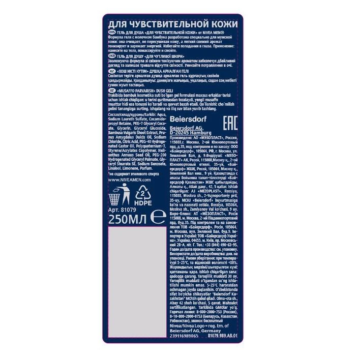 Nivea Men shower gel "for sensitive skin", with bamboo extract, 250 ml