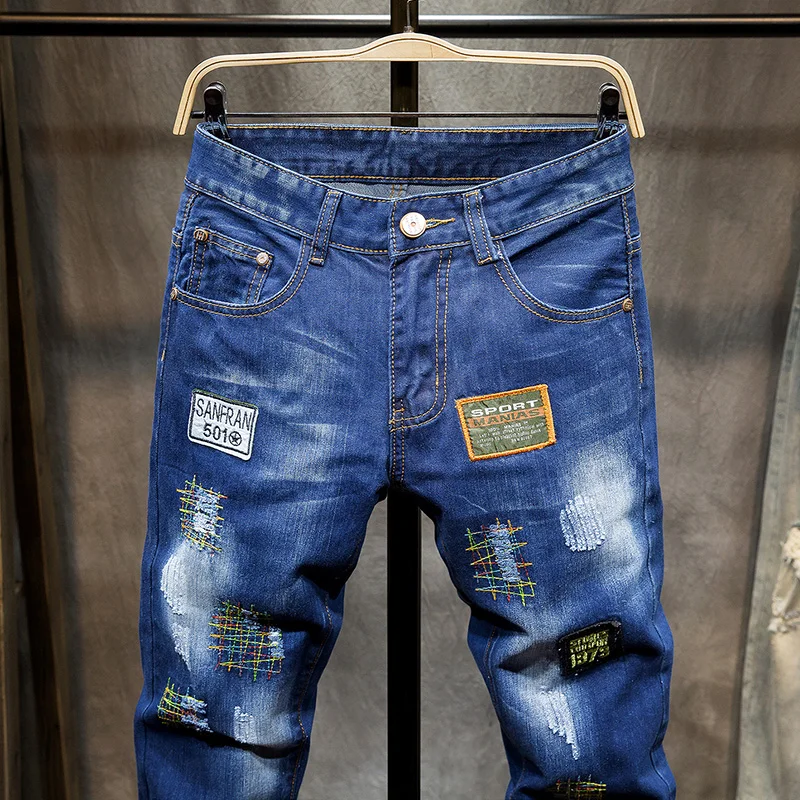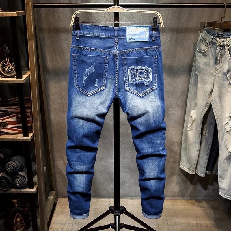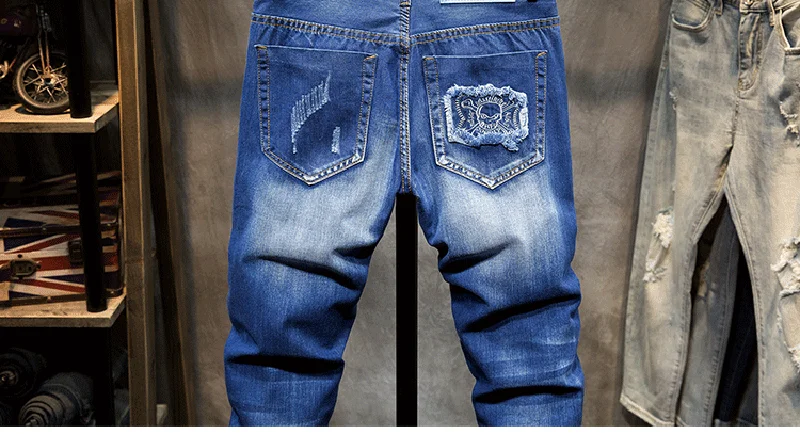 Джинсы для мужчин, тонкие джинсовые брюки, байкерские, высокое качество, мужские прямые, повседневные, дизайнерские, рваные, удобные, усовершенствованная Мода E20/1765