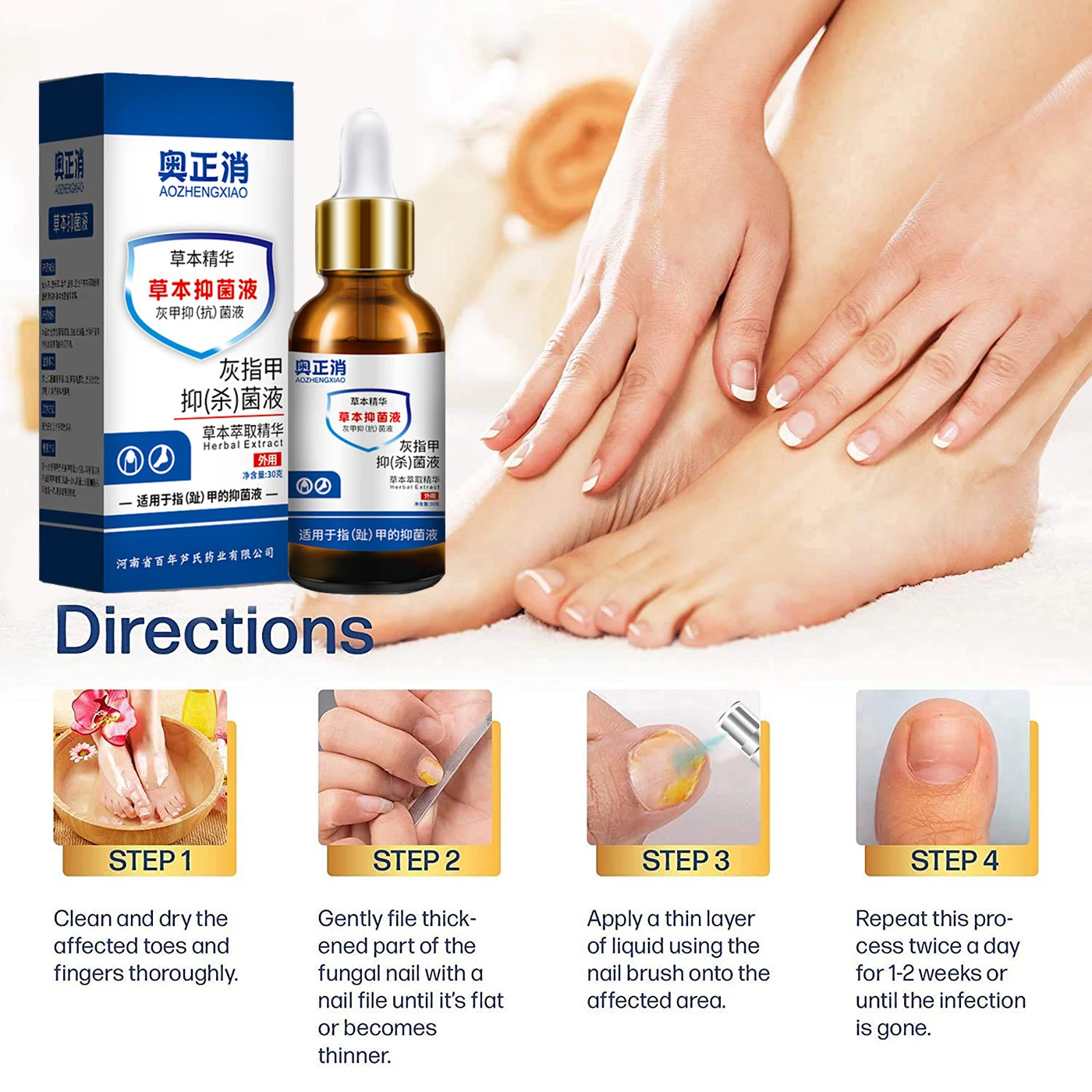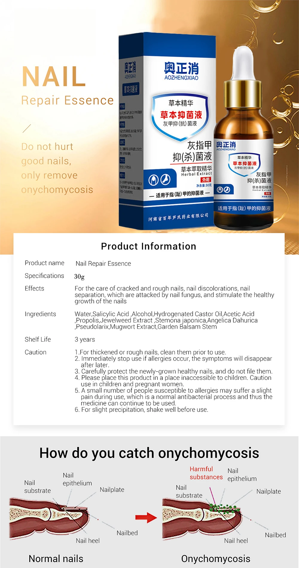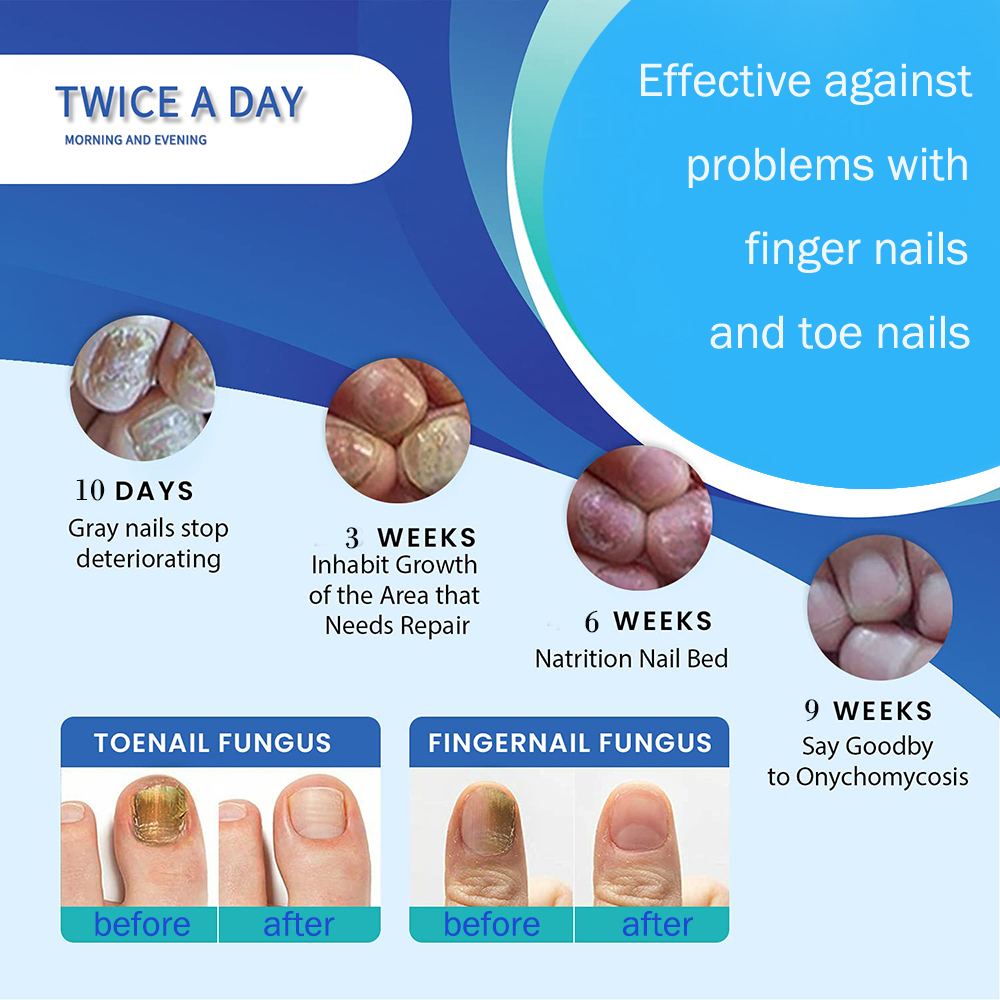 Этот продукт может обрабатывать онихомикоз, вызванный грибковой инфекцией, атрофией, неровностью, уплотнением, разрывом, пожелтением, выпадением и т. д. Долгосрочное использование способствует производству клеточных белков и укрепления ↑ он восстанавливает функции ногтей, так что ногти растут здоровым образом.