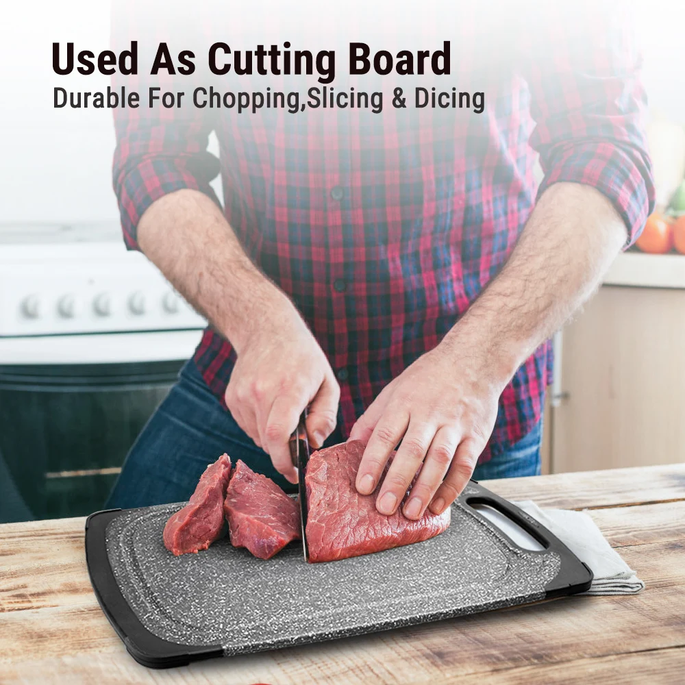 Обе стороны имеют пазы. И при разрезании на доске выловите воду для размораживания и соки из мяса, фруктов или овощей.