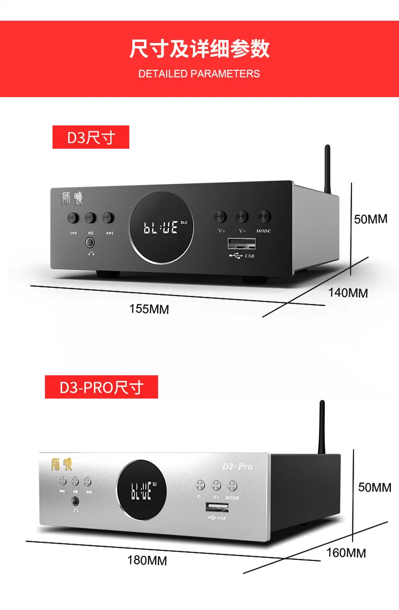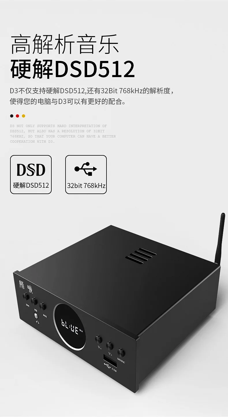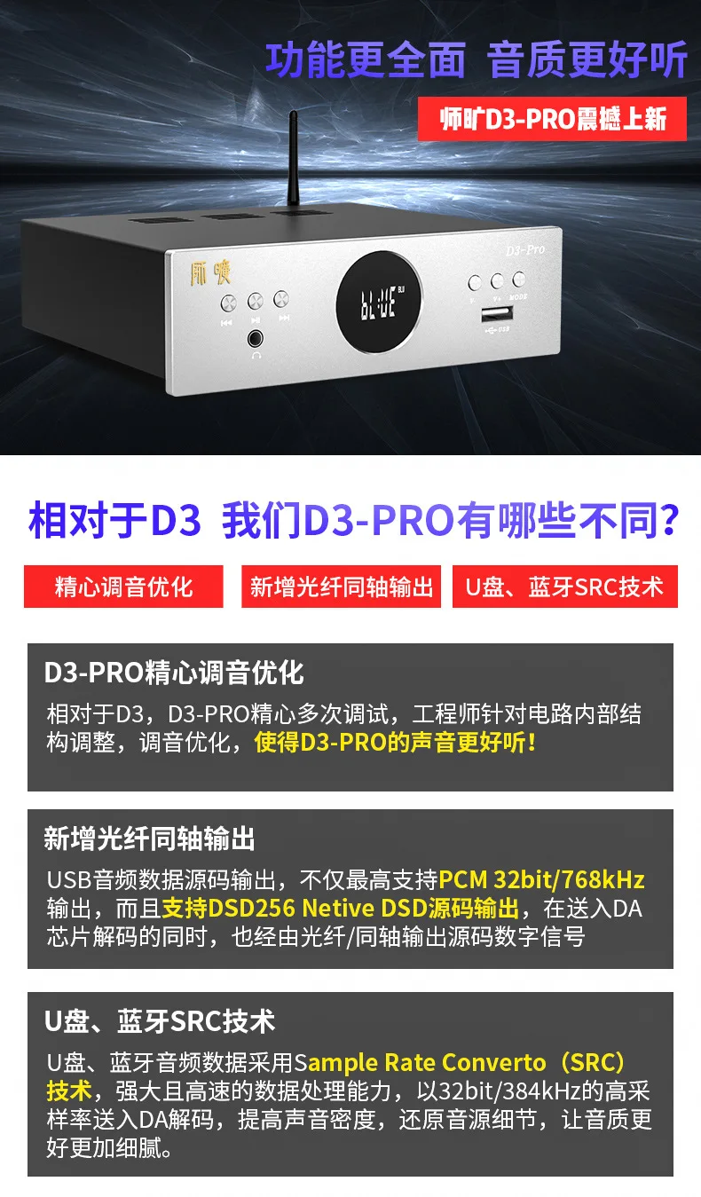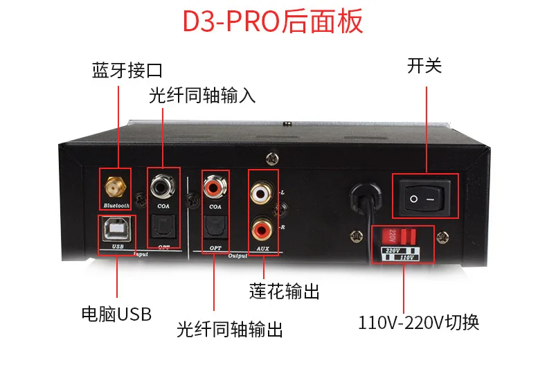 Различные режимы ввода и вывода: D3PRO может быть PC-USB, оптический, коаксиальный, bluetooth, u-диск пять входов, может быть подключен к ТВ-приставка, DVD, DCD; режим вывода имеет оптический, коаксиальный, 3,5 мм разъем для наушников, RCA, может быть подключен к усилитель мощности, короб вакуумной ампер, активная акустическая система.
