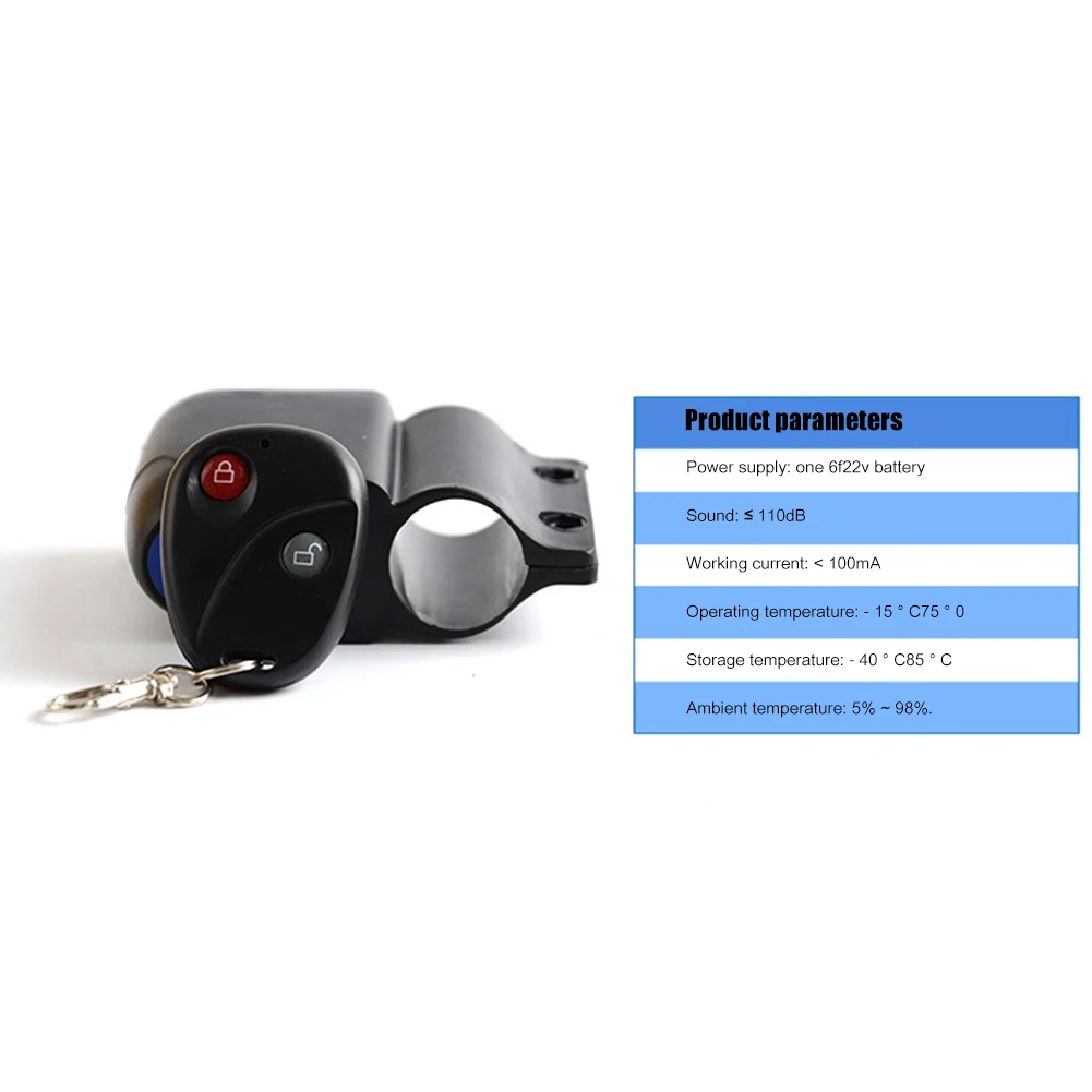 Зафиксируйте сигнализацию на раме велосипеда, нажмите кнопку Пуск, через 5 секунд, будильник будет оповещен, когда кто-то прикасается к транспортному средству, будильник будет звучать острым сигналом около 20 секунд, а затем автоматически входит в состояние оповещения. Нажмите еще раз, чтобы будильник снова, пользователь может быть закрыт в соответствии с паролем, показанным на продукте.