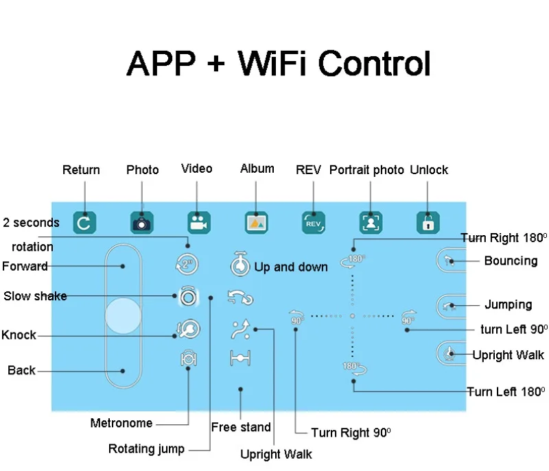 ● Вперед и назад, вправо и влево 180 точное рулевое управление, подпрыгивание, вращение на 360 градусов + подпрыгивание, ходьба в вертикальном положении,