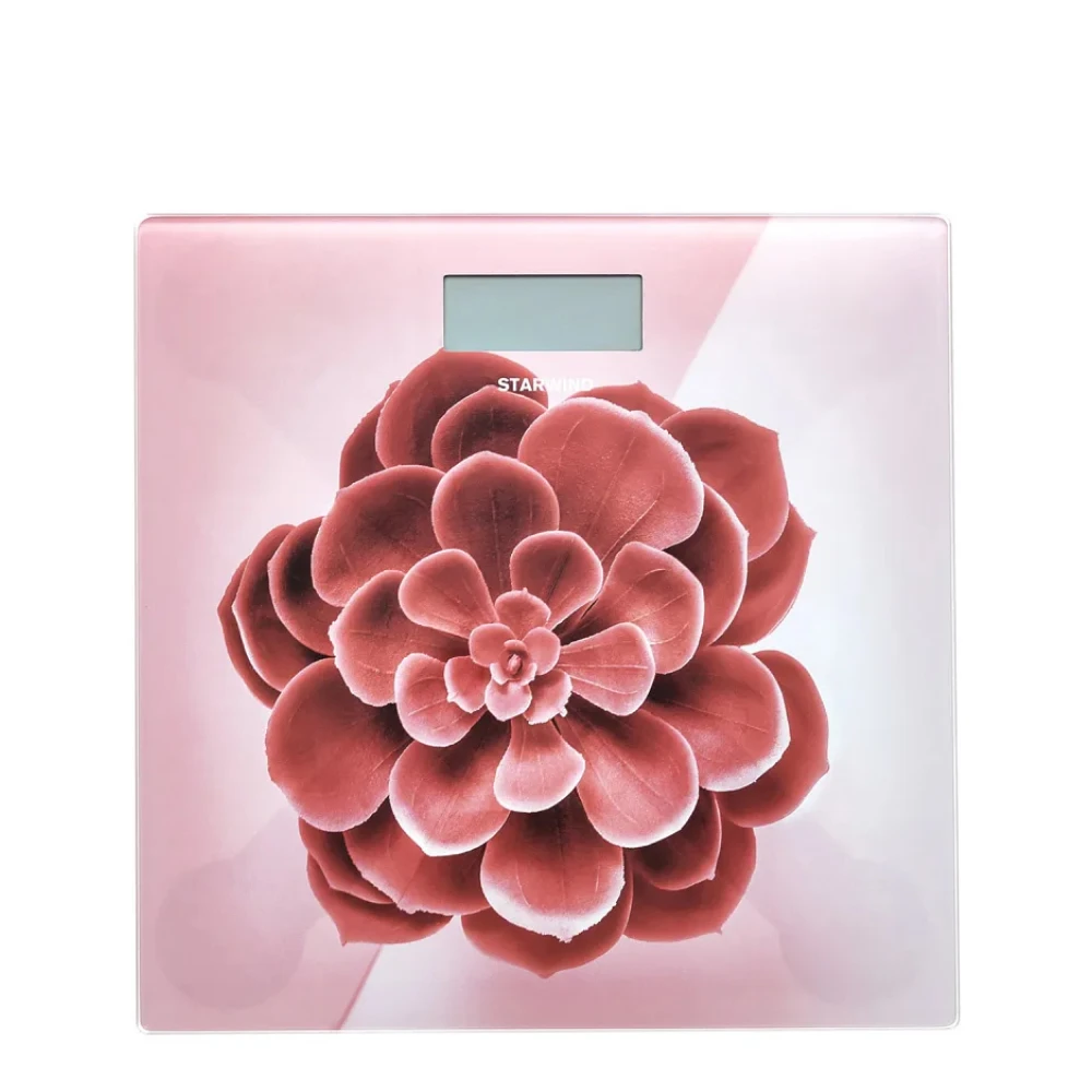 Яркий, необыкновенный дизайн электронных напольных весов STARWIND SSP6041 придется по душе представительницам прекрасной половины человечества. Рисунок выполнен в красных тонах, по центру расположен красивейший раскрывшийся цветок, ничего лишнего и в то же время завораживающе. Такой стильный дизайн не только позволит устанавливать прибор в любой комнате вашего дома, но и привнесет глоток свежести в его интерьер. Лицевая часть весов – платформа, выполнена из закаленного стекла, нижняя часть – из пластика. По периметру установлены четыре высокоточных датчика, позволяющие точно передавать вес и выводить информацию на экран, установленный в верхней части платформы. На экране также отображается помимо веса и информация об уровне заряда батареи и единице измерения. Переключается единица измерения веса с помощью кнопки, расположено на батарейном отсеке. Всего модно выбрать из двух единиц: килограммов или фунтов. Сам же батарейный отсек плотно закрывается крышкой, которая надежно фиксирует элемент питания типоразмера CR2032. Максимальный вес, который способны идентифицировать датчики составляет 180 км, при превышении данного показателя пользователь будет оповещен с помощью информационного экрана.