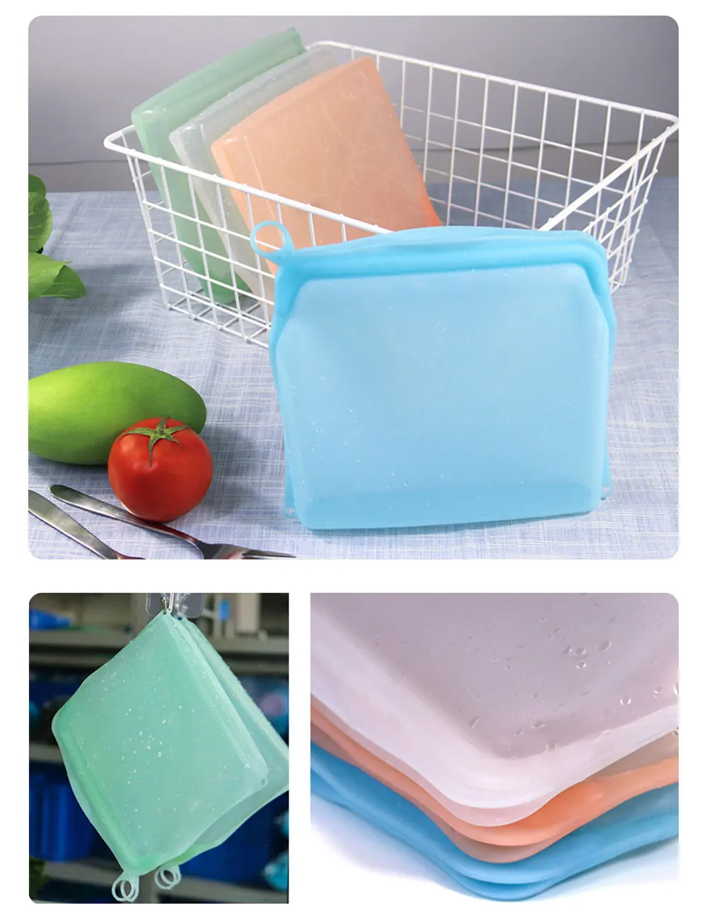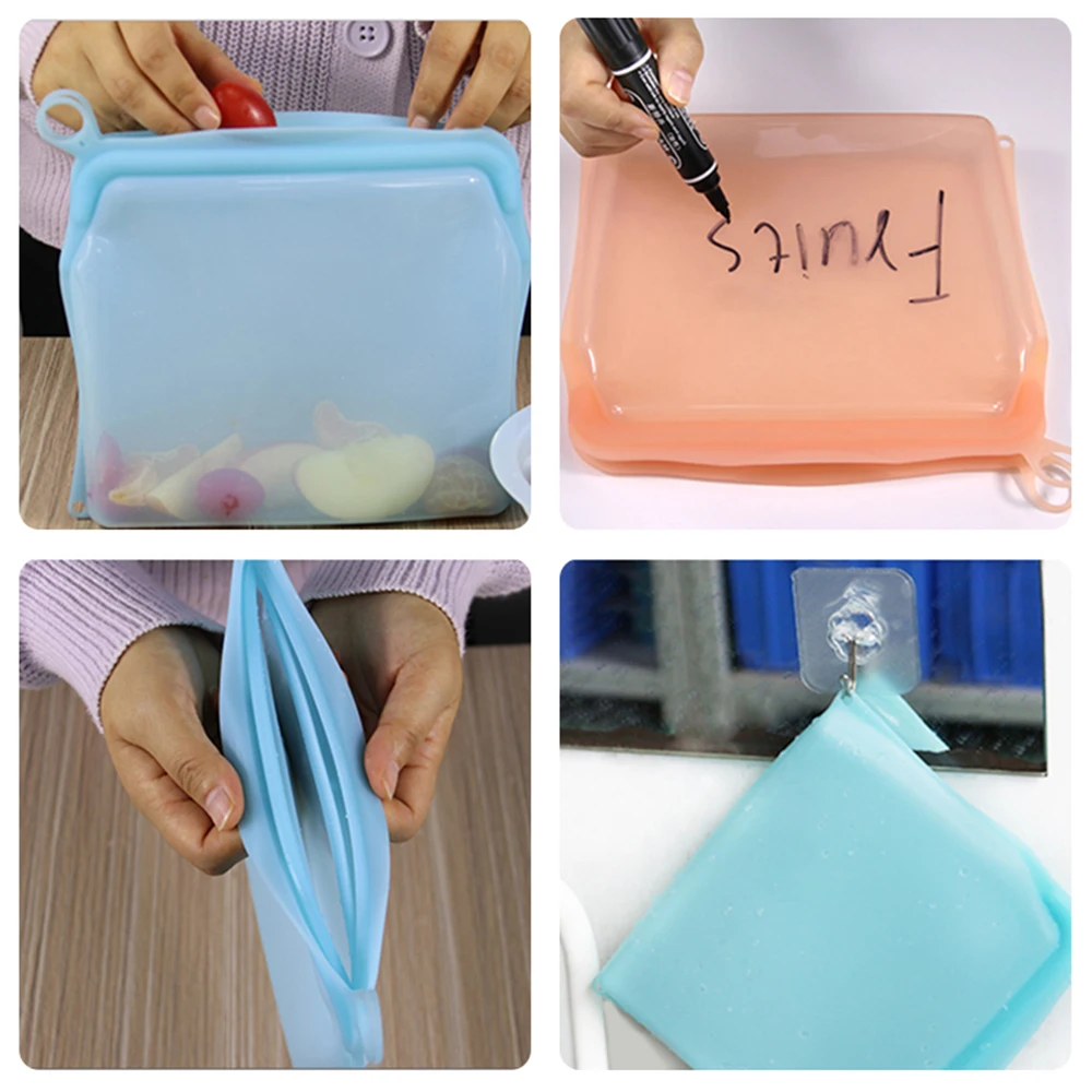 Полные функции: многоразовый пакет для хранения объемом 1200 мл, двойная уплотнительная лента + пряжка, которая идеально блокирует питание и аромат овощей и фруктов. Скорость утечки составляет 80% - 90%. Конструкция крючка удобна для сушки воздуха и может быть повторно использована после очистки