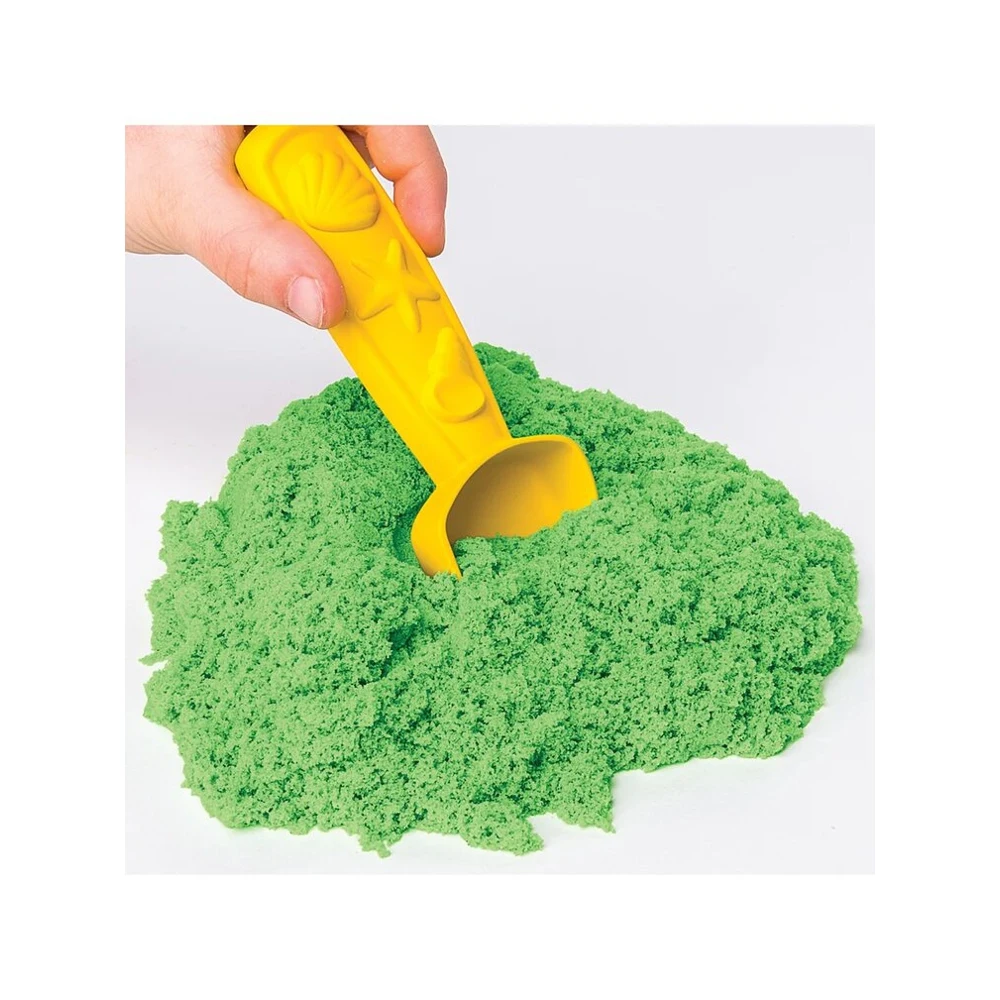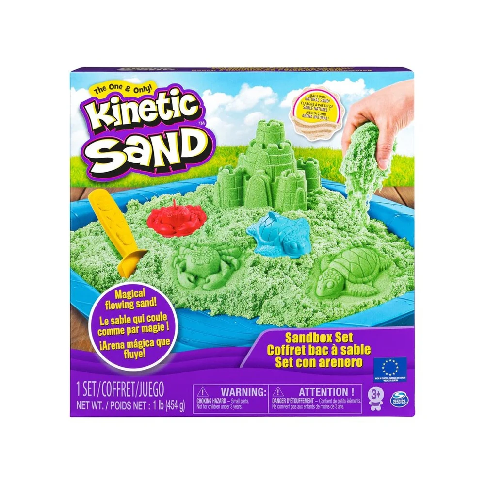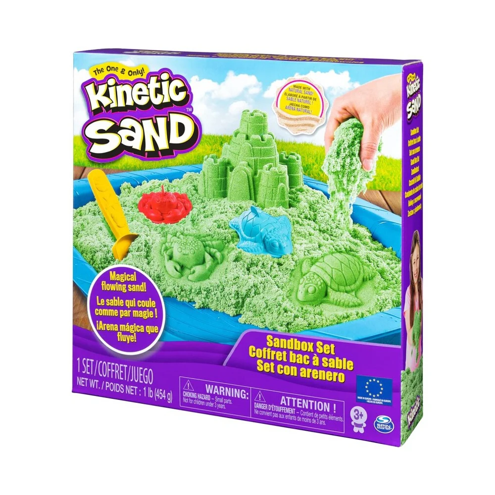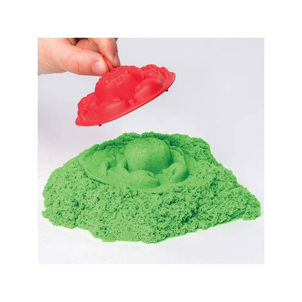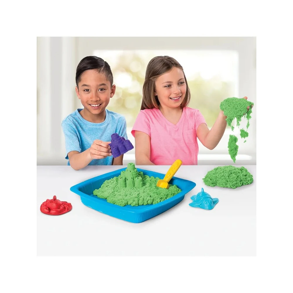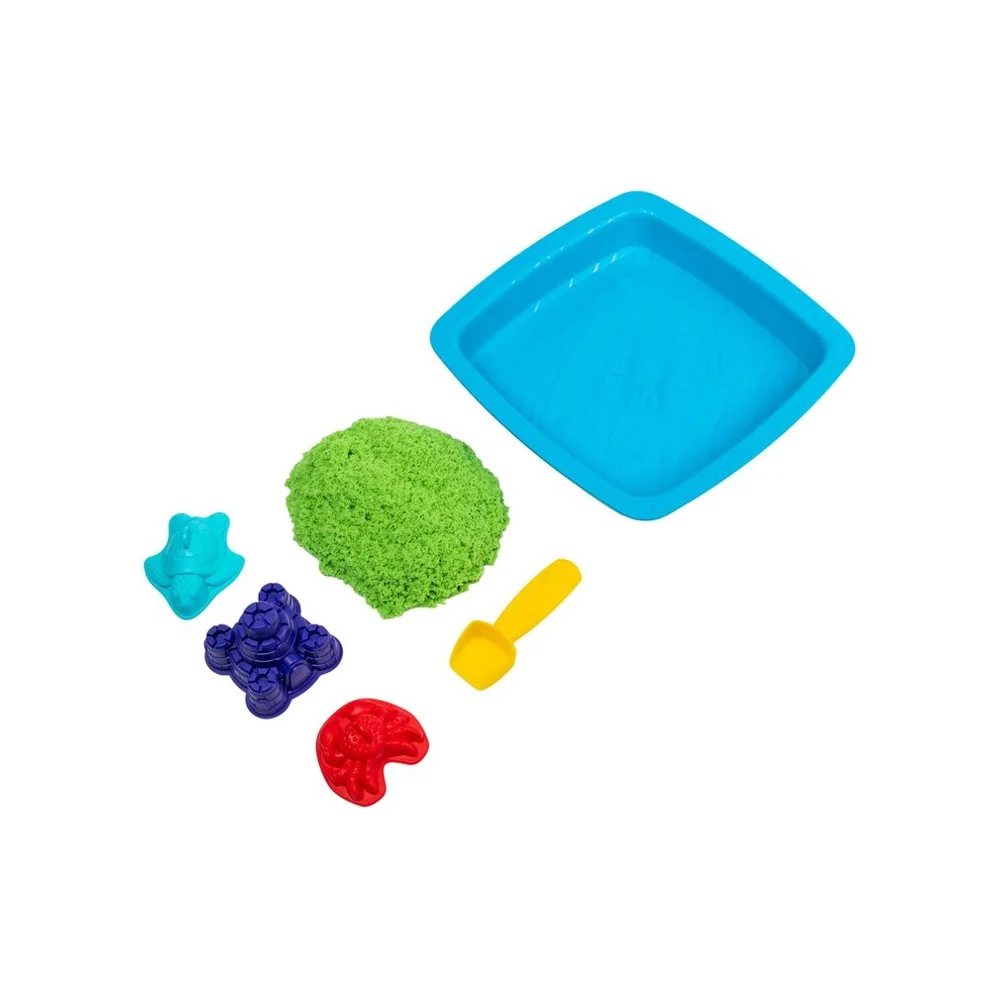 Игровой набор для лепки с кинетическим песком Кинетик Сэнд "Песочница с формочками". В набор входит 454 г. зеленого песка, 3 формочки, лопатка, песочница