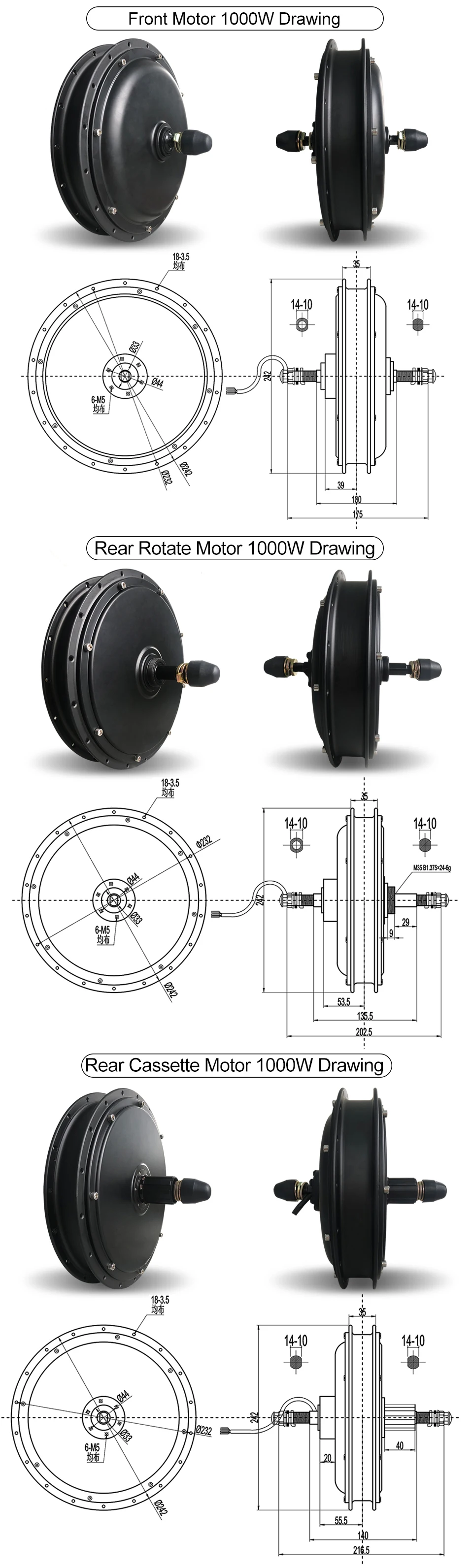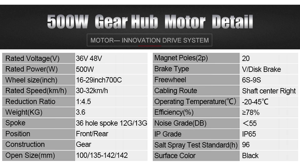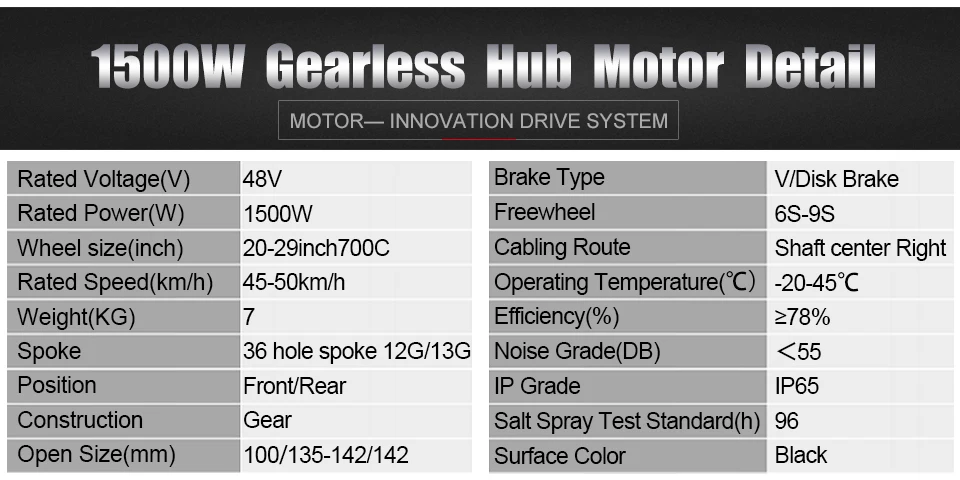 36V 48V 250W 350W 500WНоминальное напряжение (В):36/48Номинальная мощность (Вт):250 Вт 350 Вт 500 ВтКолесо Размеры (дюймы):16''20''24''26''27.5''28''29''700C250 Вт об/мин: 207-270350 Вт об/мин:231-270500 Вт об/мин: 265-325Номинальная скорость (км/ч):25-28(250 Вт 350 Вт) 30-32(500 Вт)Номинальная эффективность (%):>= 80Коэффициент уменьшения: 1:4.5Вес (кг): 3,0Открытый Размер (мм):100/135-142/142Привод и свободное колесо: N/6-9S/7S-11SРасположение кабеля: вал справаСпецификация спиц: 12 г/13 гHallsensor: ДаИнтегрировать датчик скорости; ДаПоверхность: черныйТип тормоза: V/дисковый тормозИспытание на запотевание соли: 24/96Шум (дБ):<55 дБКласс водонепроницаемости: IP6548 в 1000 Вт 1500 ВтНоминальное напряжение (В):48Номинальная мощность (Вт):1000 Вт 1500 ВтРазмер колеса (дюйм):20''24''26''27. 5''28''29'700c1000 Вт об/мин: 372-4331500 Вт об/мин:414-487Номинальная скорость (км/ч):40-45(1000 Вт) 45-50(1500 Вт)Номинальная эффективность (%):>= 80Вес (кг):7Открытый Размер (мм):100/135-142/142Привод и свободное колесо: N/6-9S/7S-11SРасположение кабеля: вал справаСпецификация спиц: 12 г/13 гHallsensor: ДаИнтегрировать датчик скорости; ДаПоверхность: черныйТип тормоза: V/дисковый тормозШум (дБ):<55 дБКласс водонепроницаемости: IP65