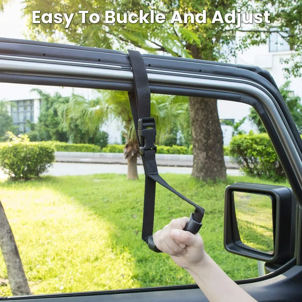 This car handle can easily put the strap around the window outline then snap the buckle.