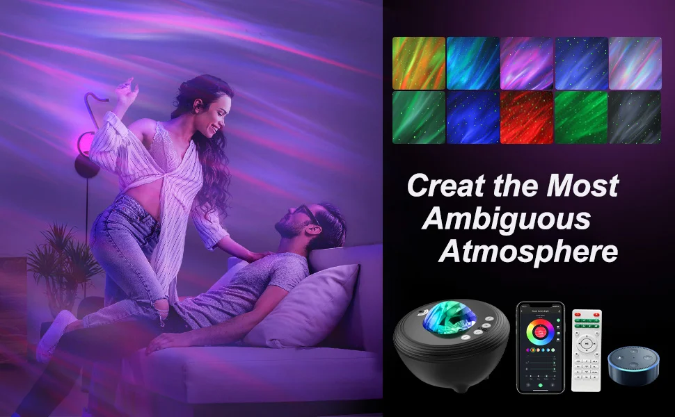 Совместимость с Alexa-свободные рукиВы можете уполномочить Alexa добавить музыку, использовать свой голос, чтобы контролировать светодиодный светильник-проектор,