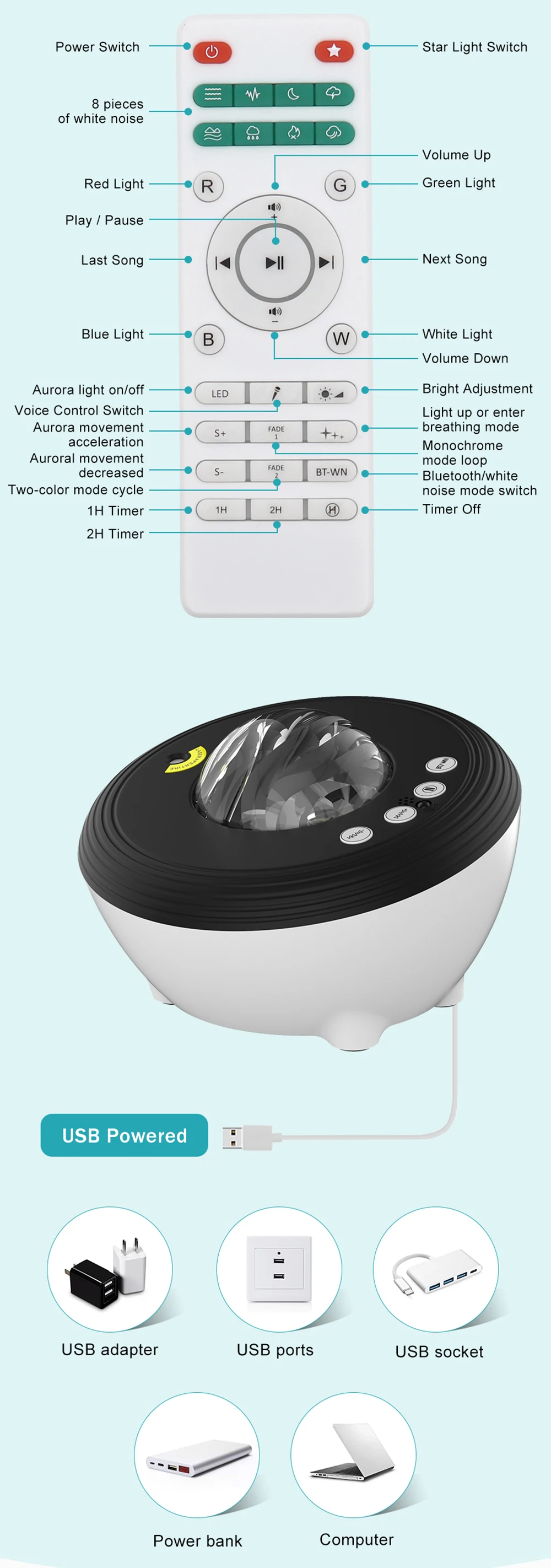 Работает со смартфонами через Bluetooth, воспроизводит локальную музыку через мобильный телефон, тогда вы увидите, что светильник изменит цвет с музыкальными ритмами. В результате происходит проекция звездного неба. Голосовое управление (только Управление скоростью светильник s). | Настройка таймера 1 ч/2 ч/4 ч для вашего сна. | Вы можете настроить свои потребности с помощью пульта дистанционного управления, выбрать режим «Аврора» или «звездное небо», Режим проекции Луны или одновременно выбрать три режима, изменить скорость цвета и яркость светильник, отрегулируйте режим громкости и звука в музыкальном режиме. |