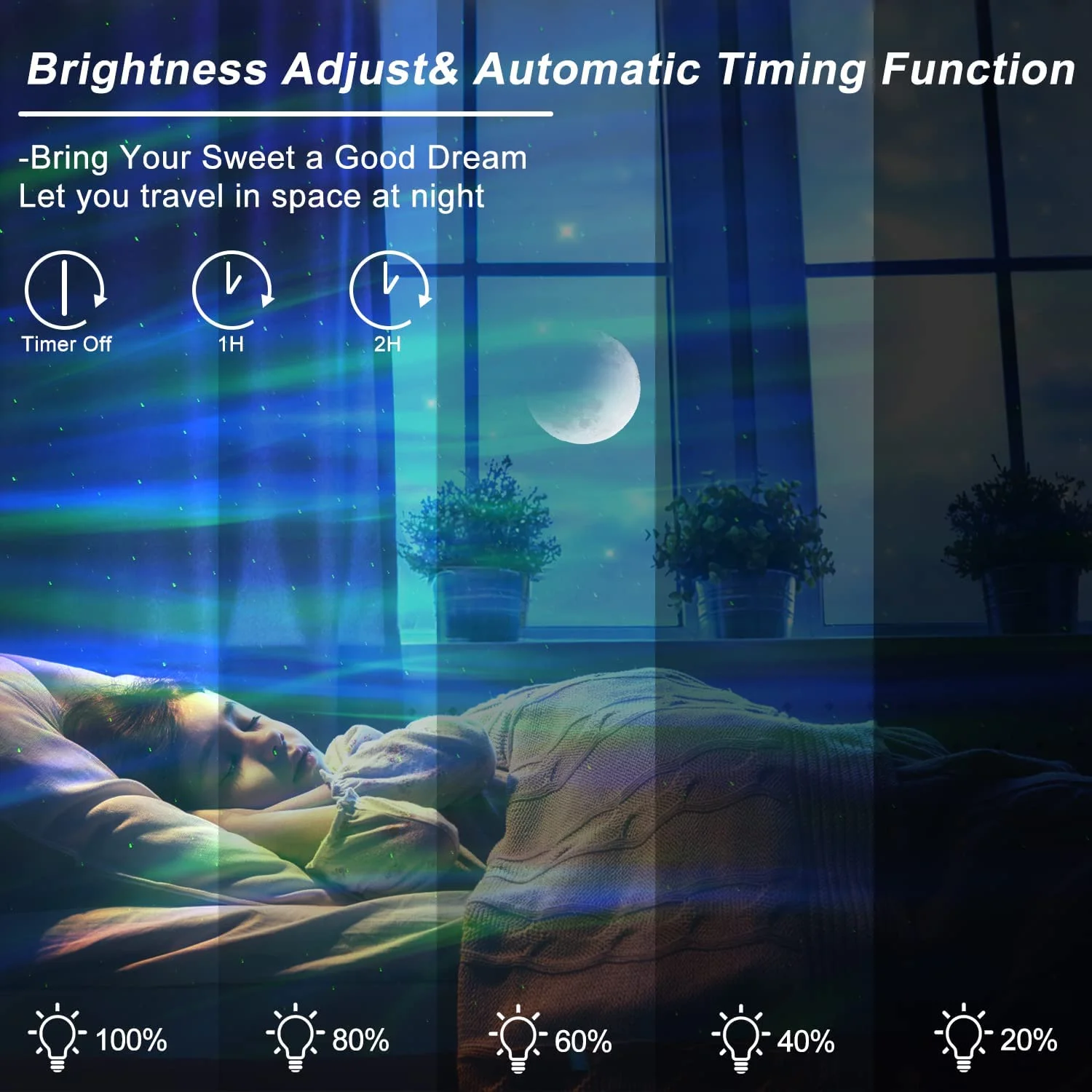 ✨【Настройка таймера и регулировка яркости 】чтобы лучше служить для украшения спальни и экономии энергии, этот светильник-проектор может быть установлен на 1 час или 2 часа. Кроме того, яркость проекции может быть скорректирована между 4 уровнями: 10%-40%-70%-100%, с помощью пульта дистанционного управления или скольжения кнопки на проекторе, это будет лучше защитить наши глаза.