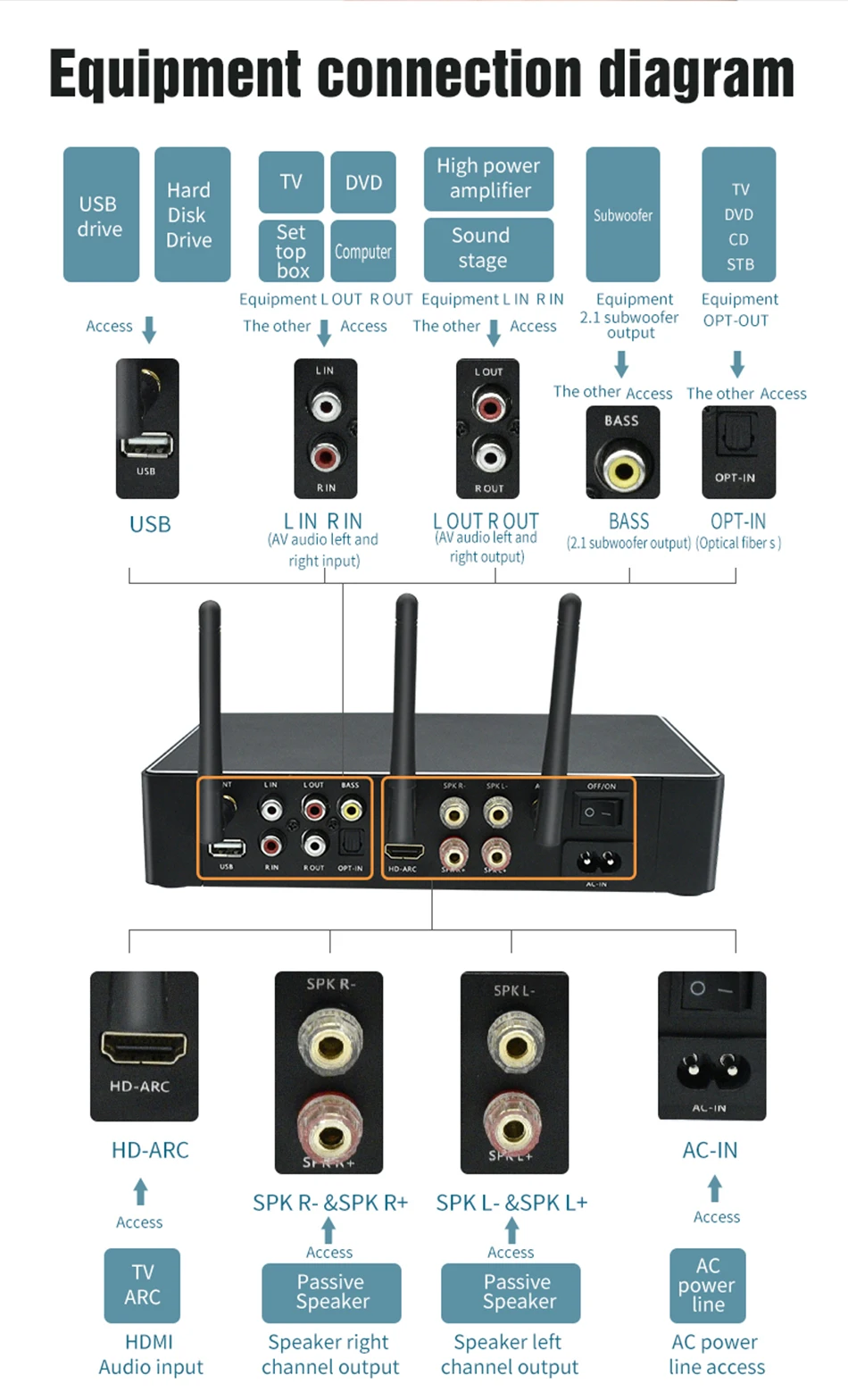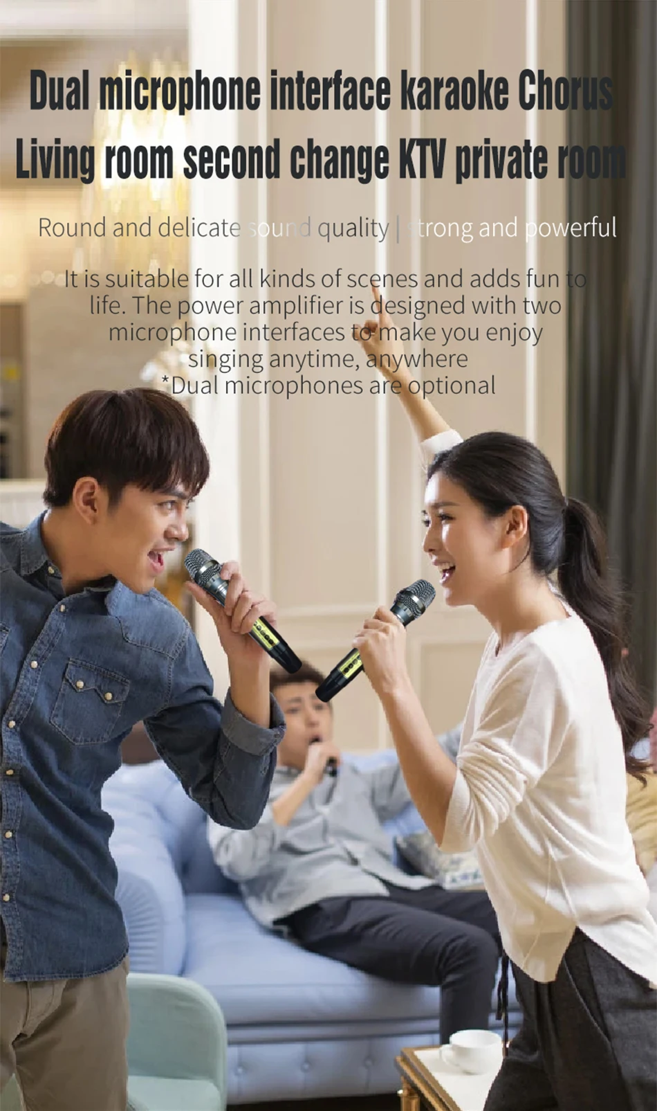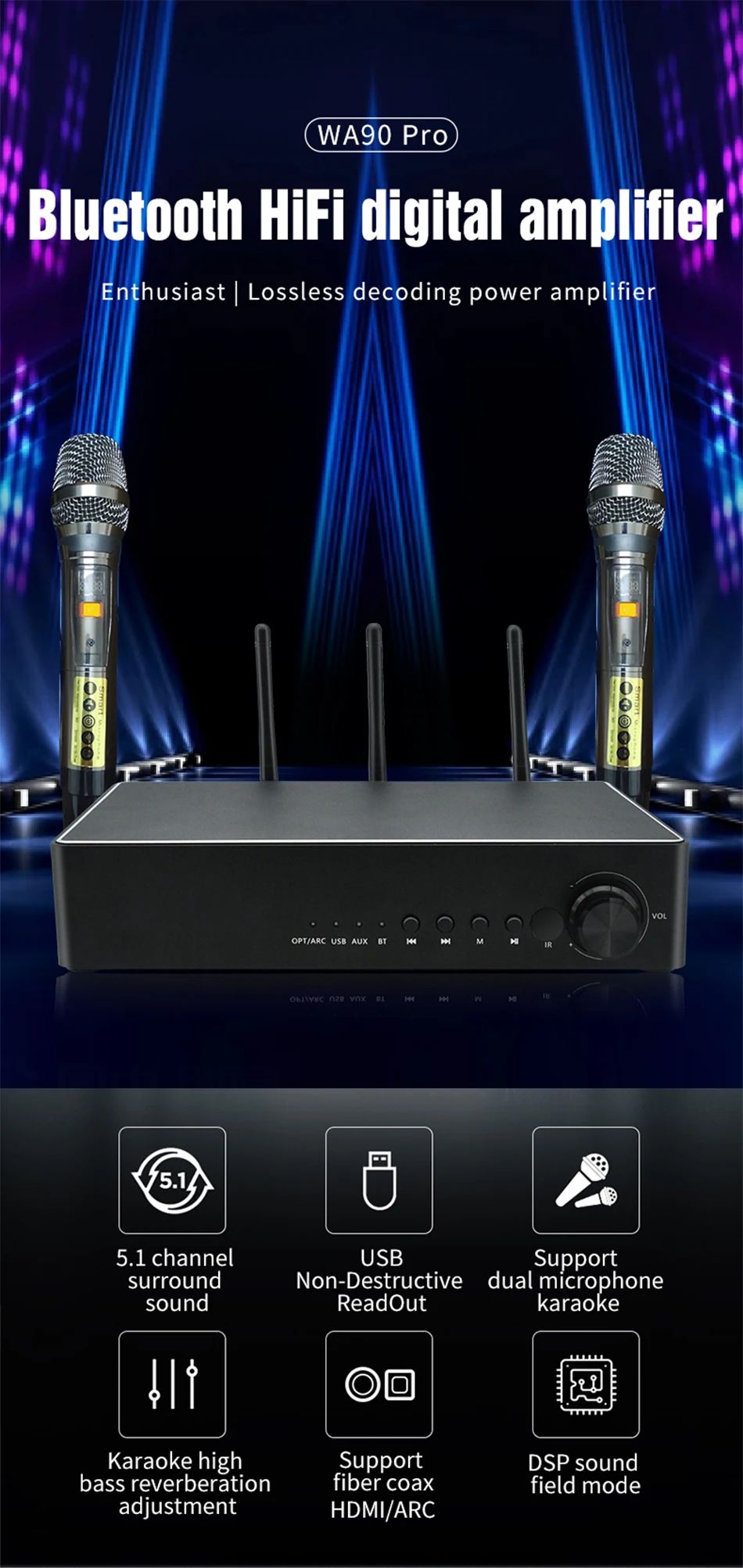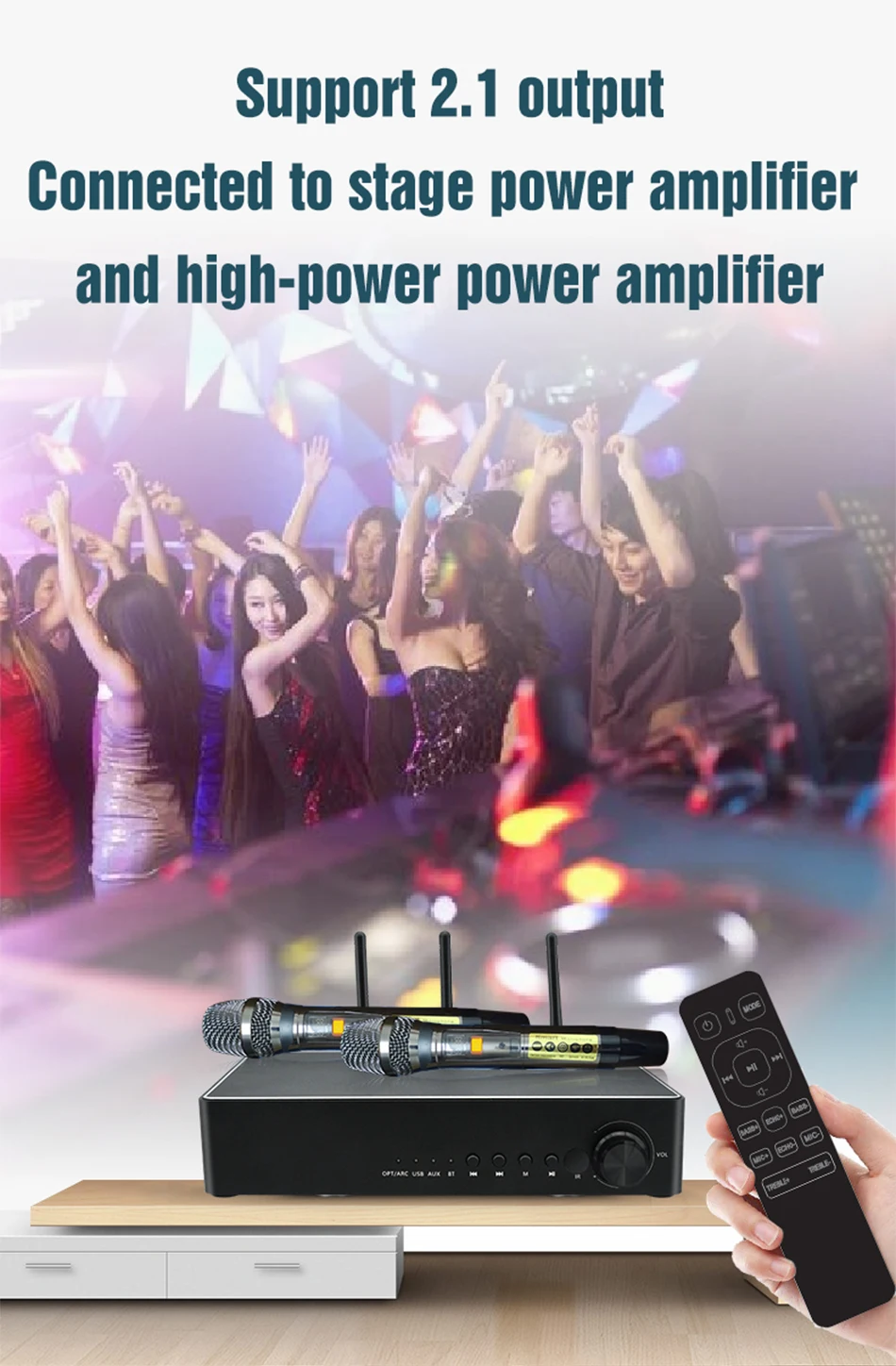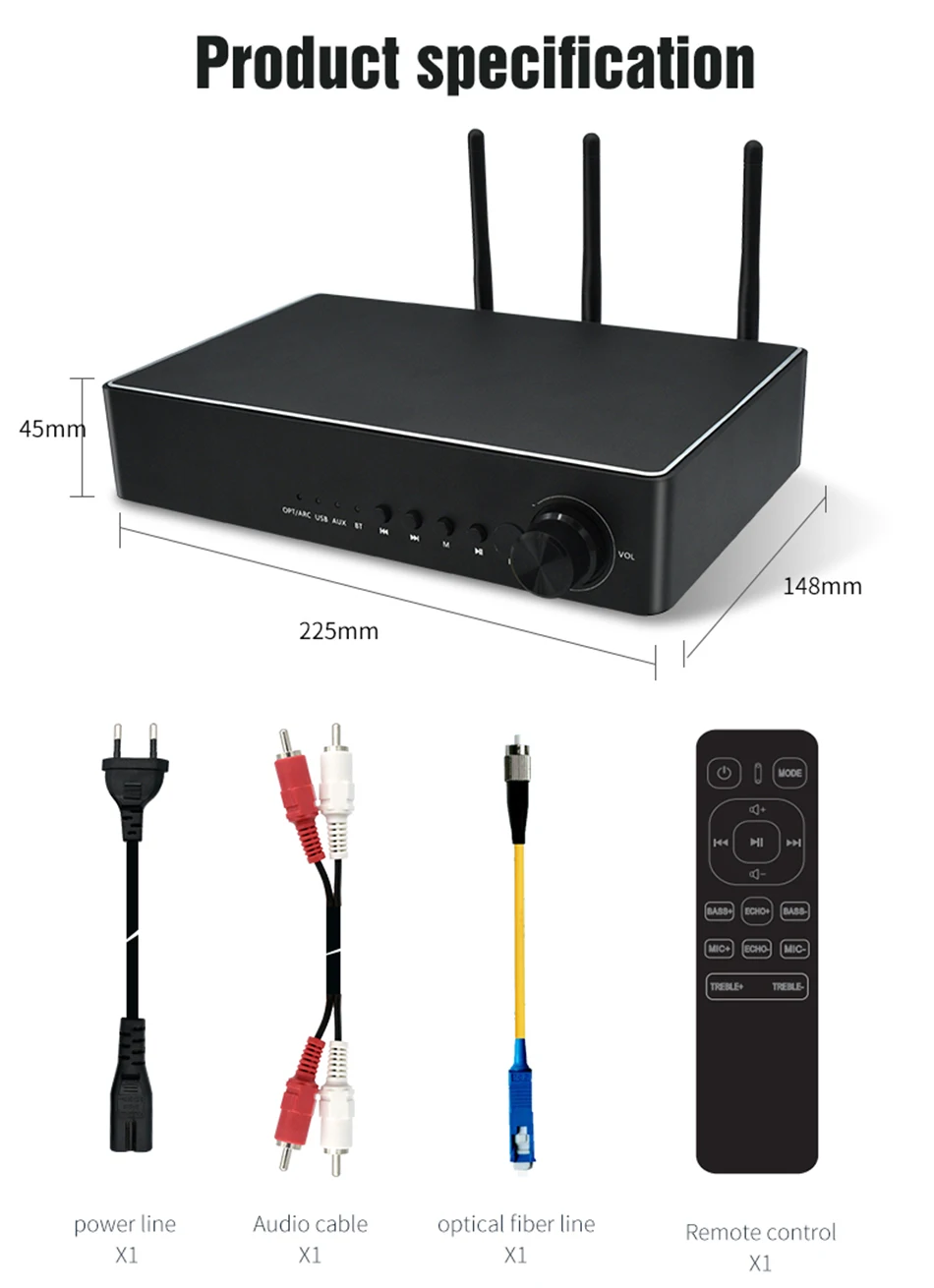 Профессиональная Настройка, высокоточная технология уменьшения, Постоянная частота, отсутствие шума, защита от помех, защита от завывания. Двухчастотная усиленная приемная антенна переменного тока, стабильный прием, расстояние приема до 50 метров.
