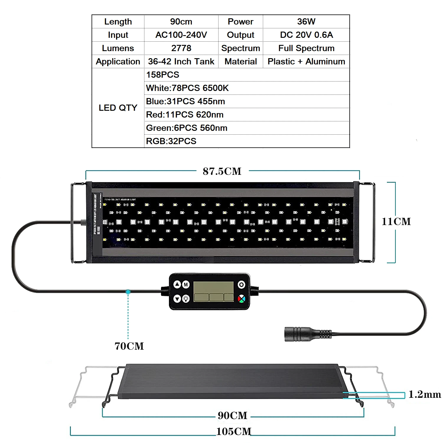 Этот тонкий аквариумный светильник smtpet WRGB 2 DC 20V. Премиум 5050 и 2835 светодиодов. 5 рядов светодиодный бусин обеспечивают яркое освещение для вашего саженого бака. 6500K белые светодиоды сочетаются с 455nm синим, зеленым 560nm и 620nm красными светодиодами, создавая эффект полного спектра освещения. Супер яркий, делает аквариумную воду более блестящей и чистой. Мульти-размер и рекомендуется для аквариума 60 - 105 см. Идеально подходит для роста водных растений.