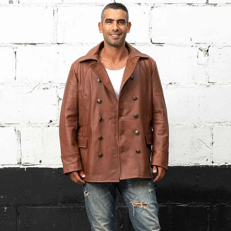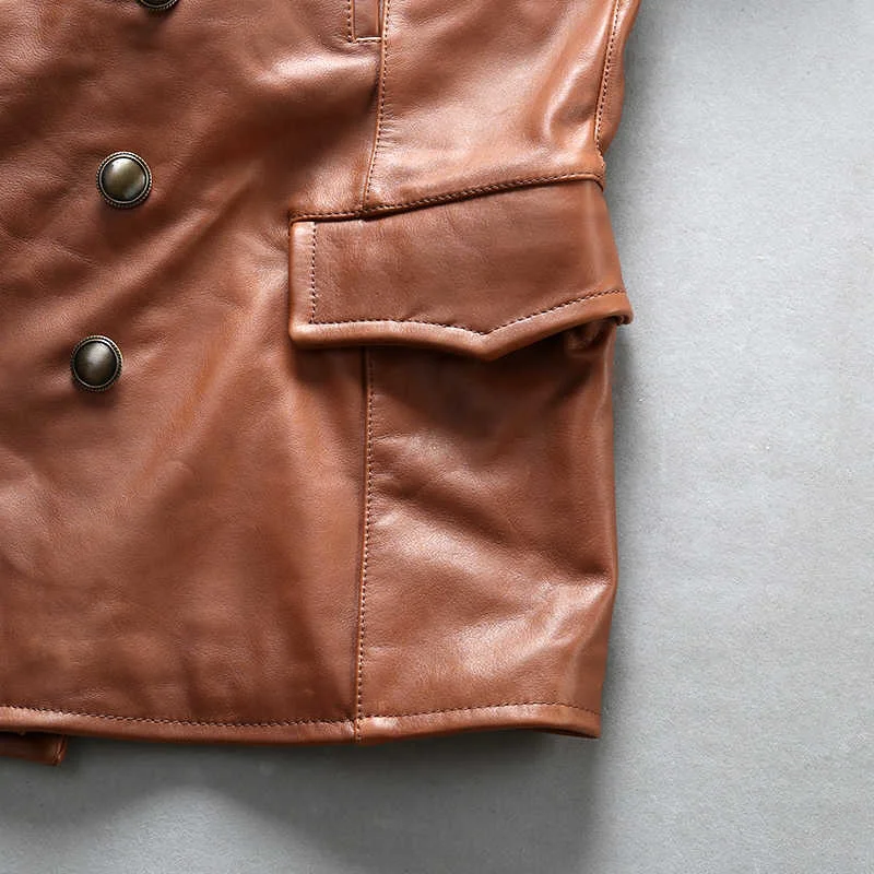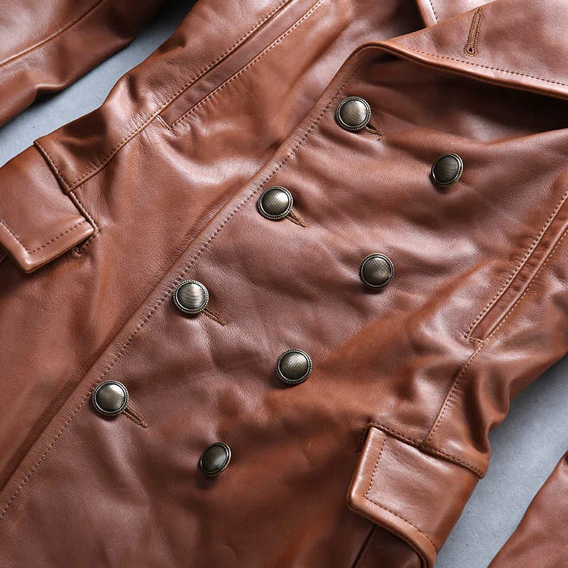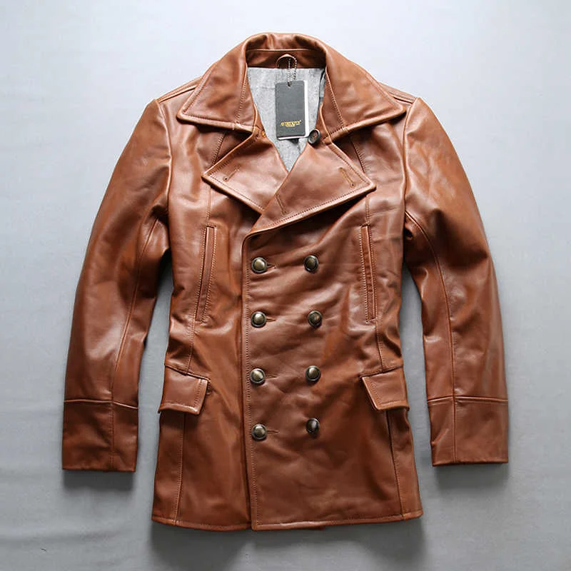 Мужская двубортная куртка AVIREXFLY, коричневая/черная длинная куртка из натуральной кожи с широкой талией, повседневная куртка из коровьей кожи