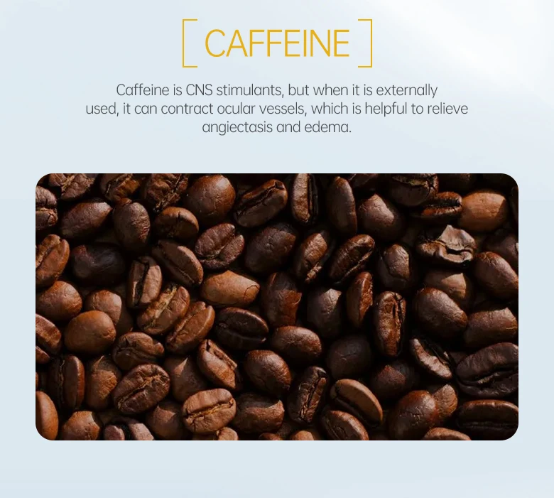 Как вид растительных алкалоидов, кофеин, добавленный в этот крем для глаз, извлекается из кофейных зерен высокого качества, что безопасно для даже чувствительной кожи. Кофеин обладает высокой антиоксидантной активностью и может стимулировать кровообращение. Поэтому крем для глаз с кофеином хорошо подходит для пышных глаз и темных кругов, вызванных поздними ночами и чрезмерным использованием глаз. И его кремовая текстура может быть равномерно нанесена и легко впитывается, но не вызовет жировых гранул.