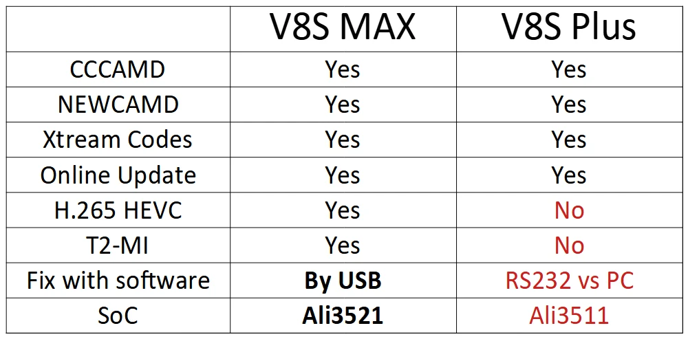 V8S MAX поддерживает H.265 и T2-MI, V8S Plus не поддерживается.