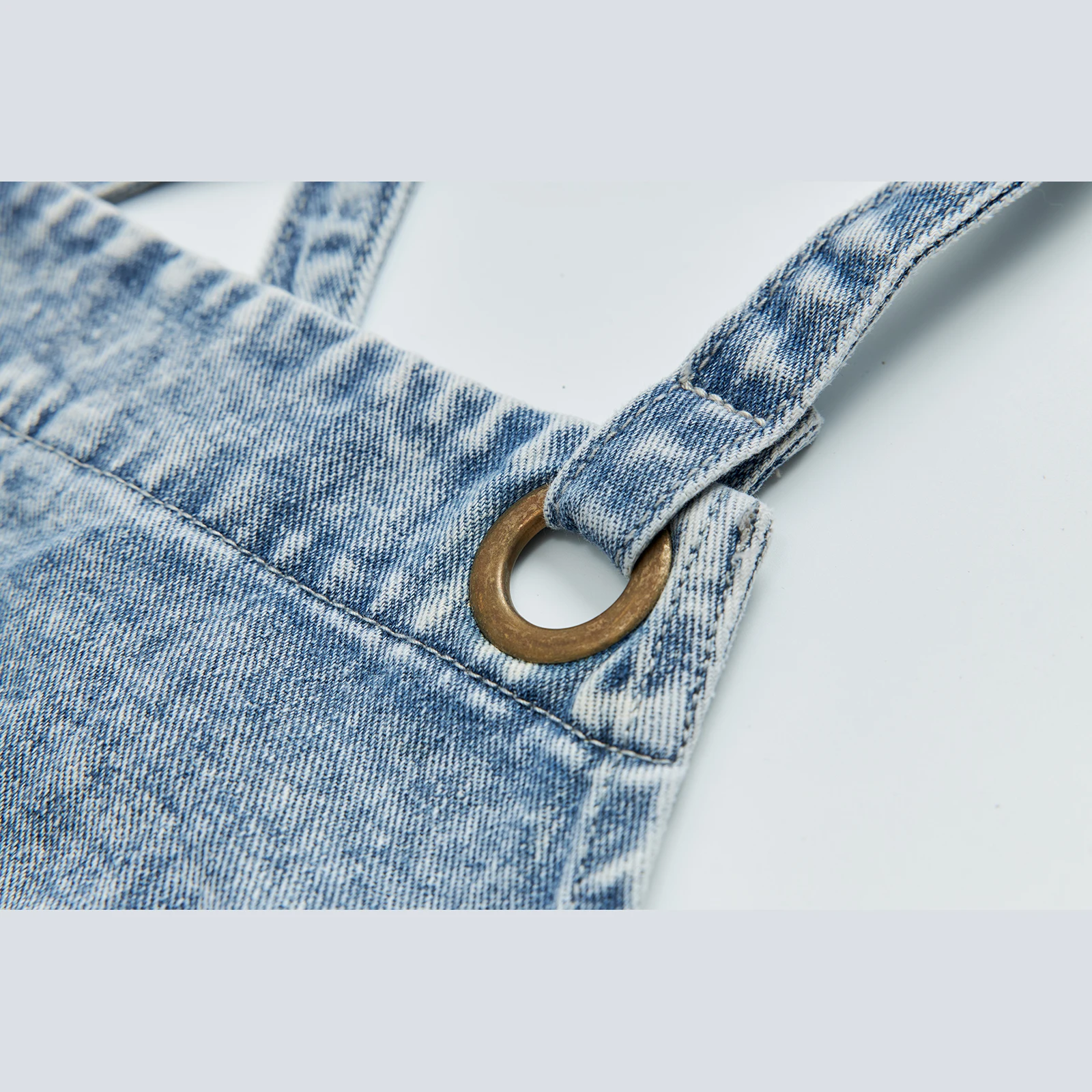 Дизайн: джинсовая ткань из 100% хлопка, специальный процесс стирки «Снежинка», карман и рукав с прорезями по краям, свежий и модный. Дизайн поперечного ремня может регулировать длину в соответствии с потребностями. Двойной шовный инструмент и большой карман-кенгуру, угловая сумка с металлическими заклепками, прочная.