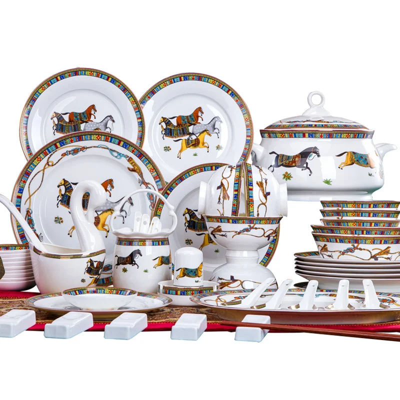 Керамическая посуда, набор посуды, миска для рисовой пасты, тарелка, блюдо для рыбы, суп, ложка, костяная китайская войная лошадь, кухонная утварь, свадебный подарок