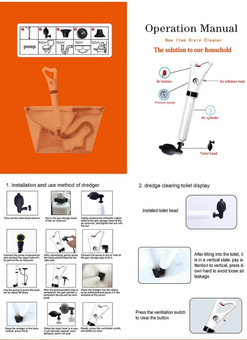 Земснаряд для канализации оснащен несколькими дренажными головками, а именно: насадкой для унитаза, земснаряд для мойки овощей, дренажной головкой для раковины, конвертером и подножкой для воздушного насоса.
