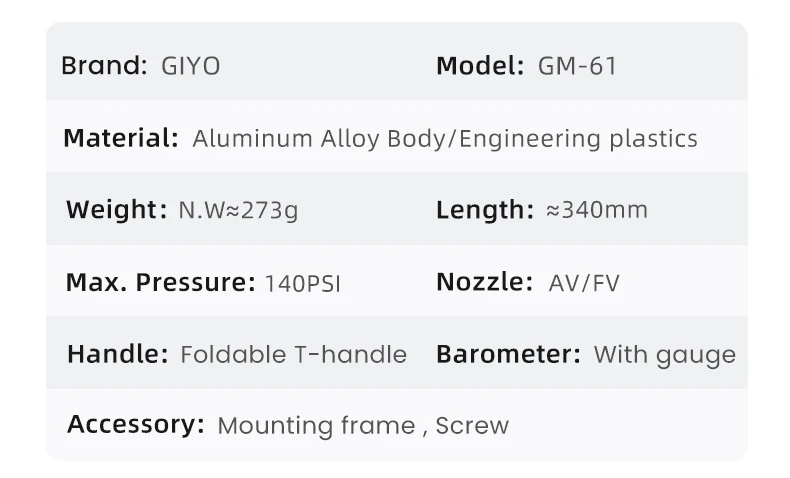 Информация о продукте:* Модель: GM-821G* Вес нетто: 187 г* Размер: 290x22 мм* Максимальное давление: 140psi* Тип: напольный* Ручка: складная t-ручка* Барометр: с манометром* Материал: корпус из алюминиевого сплава/инженерный пластикОсобенности продукта:** Высокое давление/портативный/мини** Подходит для клапана Presta / Schrader** Вращающаяся труба/Удлинительный шланг** Манометр 140psi** Складная напольная стоящая часть