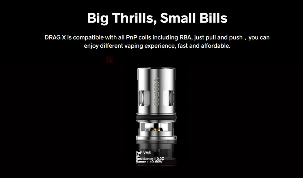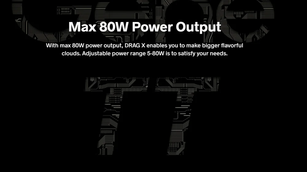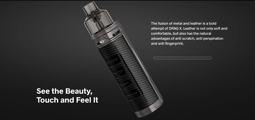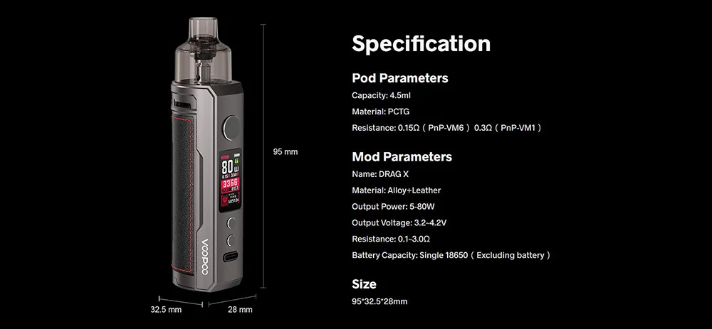 Набор Drag X изготовлен из металла и кожи, поэтому Drag X не только мягкий, но и имеет преимущества против царапин, против пота и отпечатков пальцев. Питание от одного аккумулятора 18650. С новым чипом GENE.TT, Drag X имеет быстрое зажигание (всего 0,001 s) и высокий взрыв. Чип GENE.TT также предлагает интеллектуальные функции, такие как PUSS и режим рейтинга баллов. Кроме того, режим рейтинга очков помогает вам непрерывно разблокировать новый уровень от «железного» до «Короля» в соответствии с размером облака каждого всасывания. Он поставляется с диапазоном мощности 5-80 Вт, чтобы соответствовать вашим потребностям, а максимальная мощность 80 Вт позволит вам сделать более ароматные облака. Drag X разработан с инновационной бесконечной системой воздушного потока, которая поддерживает регулирование любого размера дыхательных путей. Самое главное, вы можете наслаждаться самым комфортным опытом с помощью этой системы независимо от того, какой вид катушки или различные параметры установлены! Что касается pod, он может держать 4,5 ml большие вмещаемый объем жидкости для электронных сигарет и применяем широкий спектр катушки, в том числе РБА. К этой капсуле также добавляются адаптеры 510 и другие новые технологии. Drag X оснащен катушкой PnP 0,15 Ом и 0,3 Ом и совместим со всеми катушками PnP.