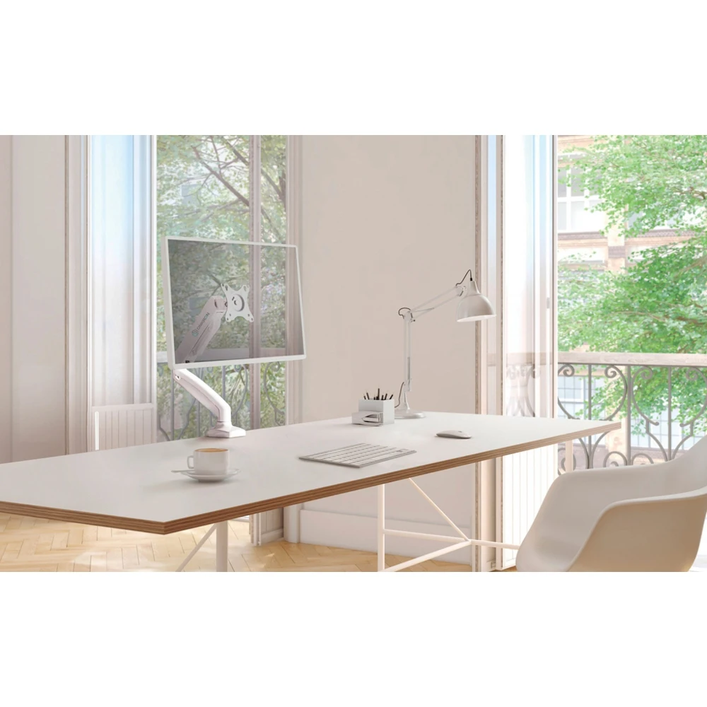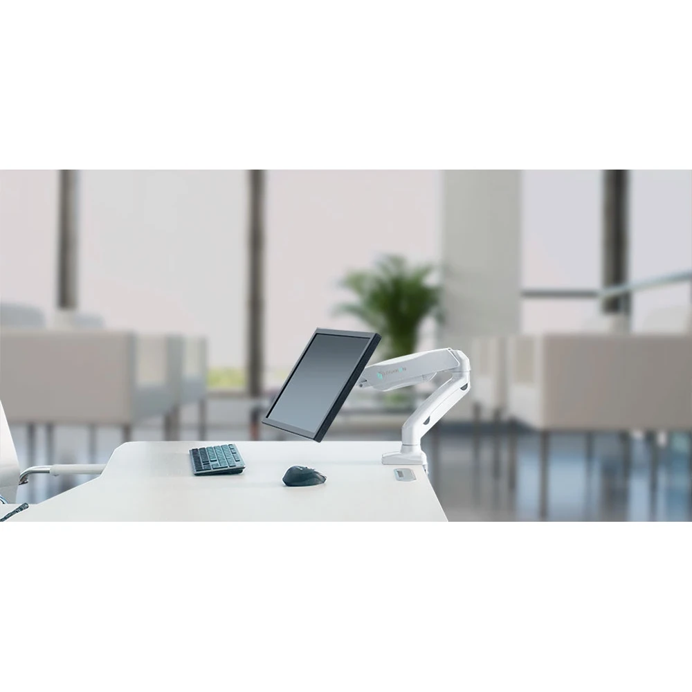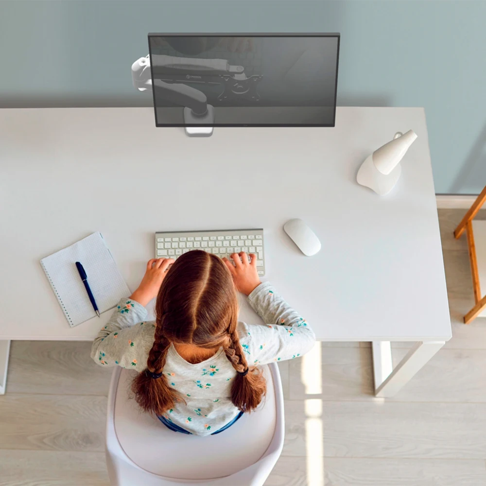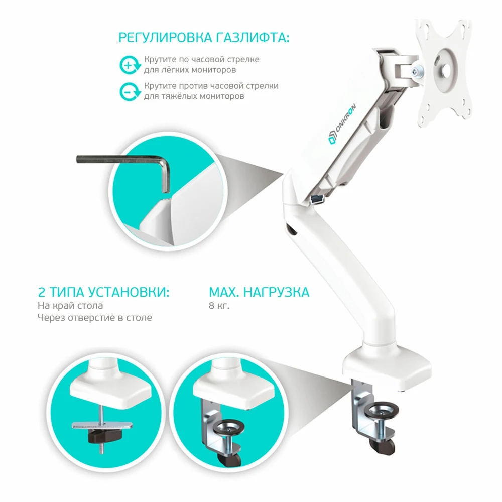 Настольный газлифт. Для экранов 13" ~ 32". Макс. нагрузка 8 кг. Угол наклона -45° ~ +90°. Расстояние от основания 0 ~ 470 мм. Вертикальное перемещение 170 ~ 410 мм. Крепежные отверстия (VESA) 75x75, 100х100 мм. Вращение 360°. Материал алюминий