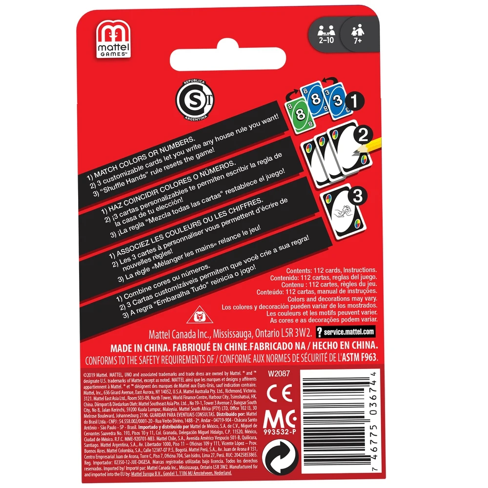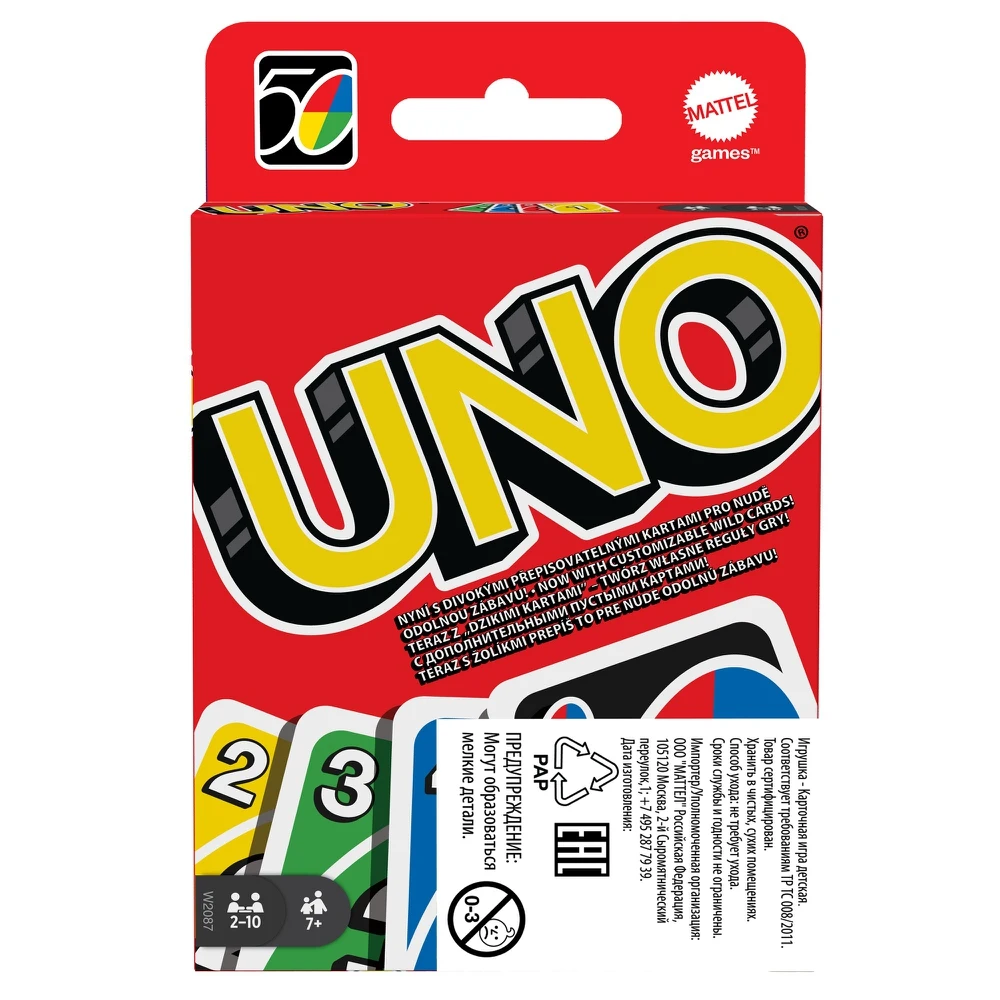 Игра карточная Games UNO 112 карт в дисплее W2087 Классическая карточная игра "UNO" затягивает, а особые карты придают игре остроты. Цель игры состоит в том, чтобы первым избавиться от всех своих карт в каждом раунде и набрать очки за карты, которые остались на руках у других игроков. Очки за каждый раунд складываются и игрок, набравший первым 500 очков, выигрывает. В колоде есть особые активные карты, к примеру, “пропусти ход” или “закажи цвет”, которые могут изменить ход игры. Если тебе выпала карта “обмен картами”, ты можешь поменяться картами с любым игроком. А еще есть 3 пустые карты, на которых ты можешь написать свое правило, чтобы одержать быструю победу над противником. Когда на руках останется одна карта, главное – не забыть выкрикнуть"UNO"! UNO и связанные с ним товарные знаки, и фирменный стиль принадлежат Mattel.