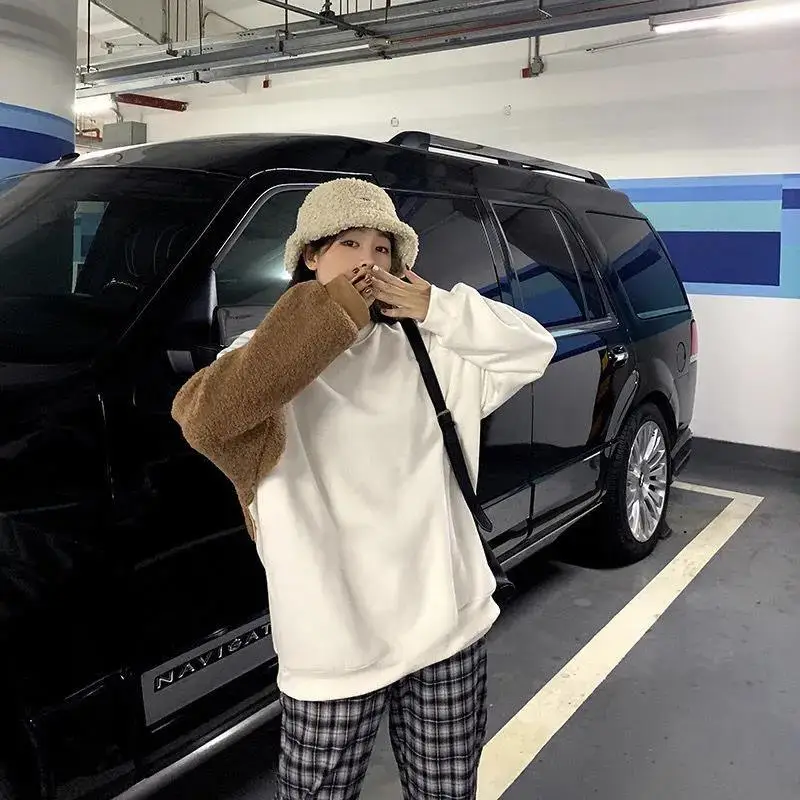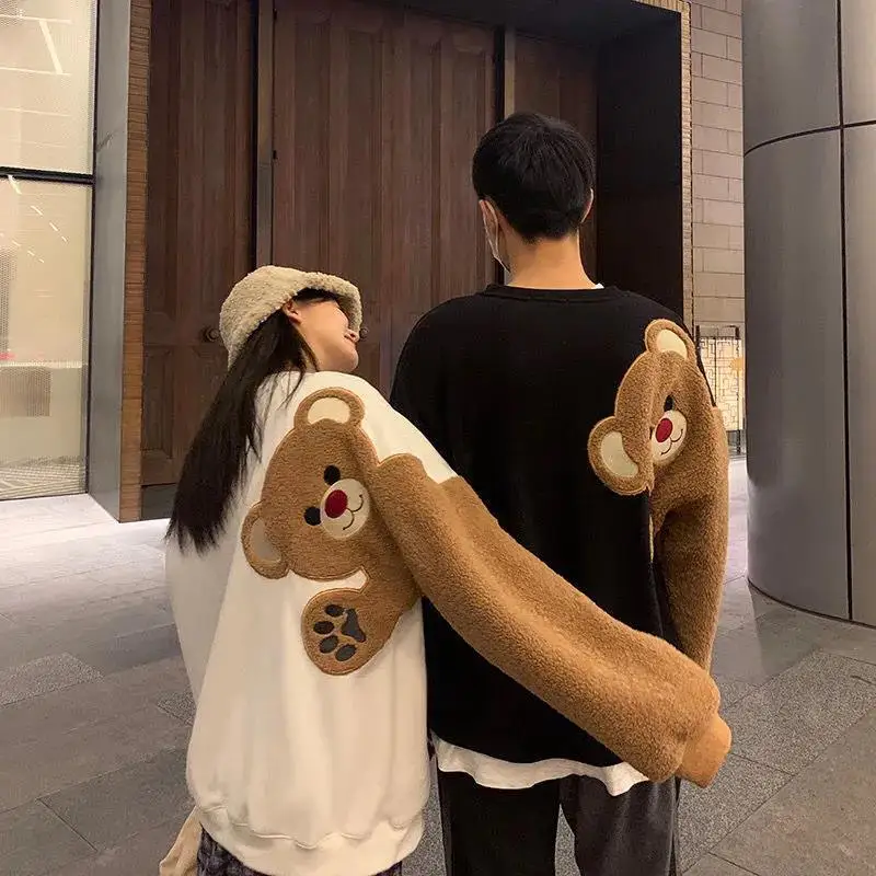 Пара свитеров ягненка вышивка балахон Повседневная o-образным вырезом сплайсинга милый медведь негабаритных Свободные универсальные толстовки 2021 Осенние Топы