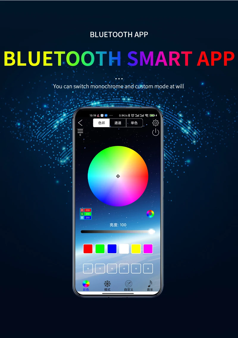 4. Разные цвета-светодиодный светильник транспортного средства производит синий, зеленый, фиолетовый, красный, сине-зеленый, белый и желтый. Система освещения транспортного средства также имеет многоцветный мигающий режим, который очень подходит для синхронизации музыки с ритмом.
