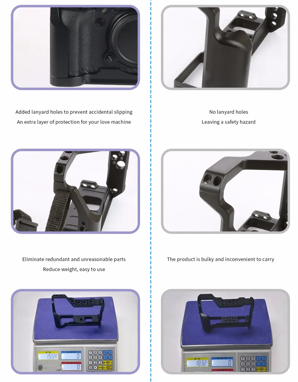 2. Цельнометаллический материал, точная обработка с ЧПУ, обработка поверхности анода анти-окисления, точное позиционирование и твердая безопасность. Не блокирует отсек для карт памяти или отверстия для кабеля передачи данных, не блокирует экран, поэтому его можно легко открыть и закрыть