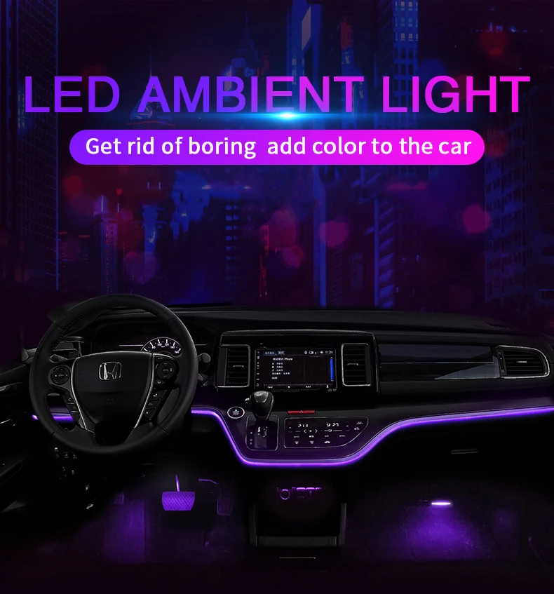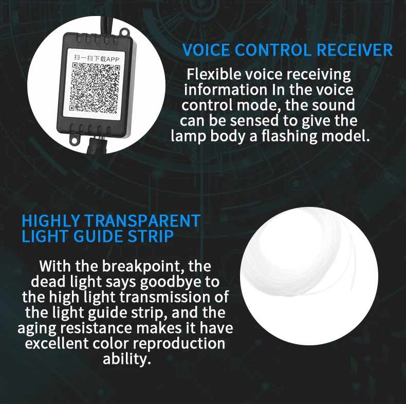 1) звуковые активные эффекты. Светодиодный светильник для автомобиля оснащен звуковыми датчиками, которые позволяют синхронизировать светодиодный индикатор с музыкальным ритмом. Светодиодный светильник-полоска отслеживает износ и настраивает мигание, чтобы соответствовать силе звука.