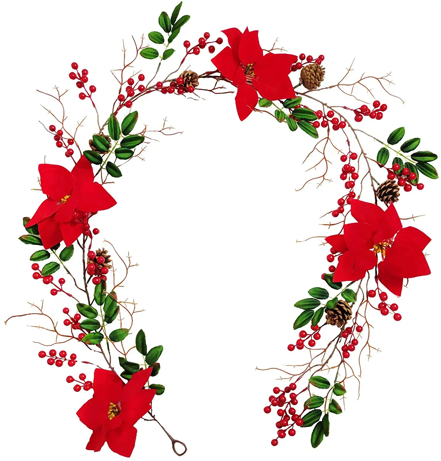 🎄🎅Рождественская гирлянда: гирлянда с искусственным пуансеттийным покрытием размером 5,6 футов, ветви с красной ягодой и искусственным зеленым узором, украшение из соснового конуса для рождественских елок, манелей, лестничных перил, создающее уникальную атмосферу для вашего Рождества.