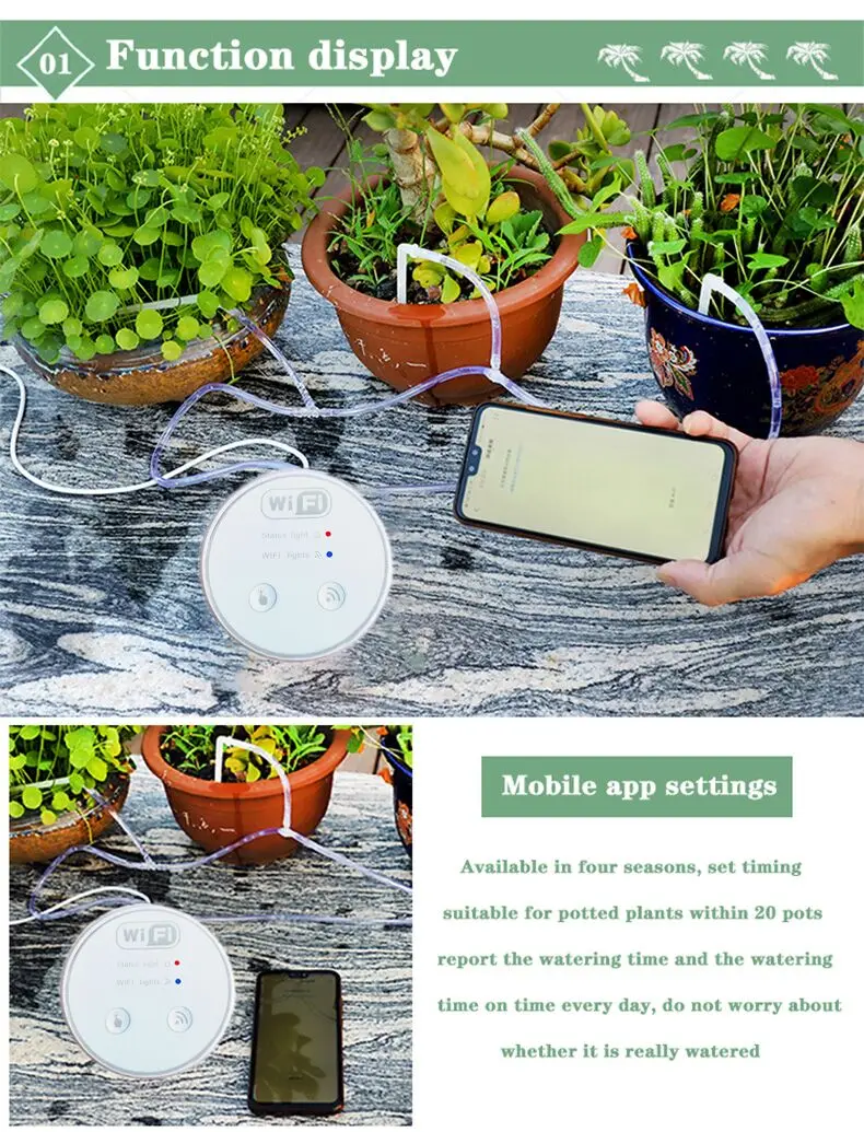 * Настройки мобильного приложения, доступны в течение четырех сезонов, установить время, подходит для использования горшечных растений в течение 20 горшков, сообщать время полива и время полива каждый день, не беспокойтесь о том, действительно ли он полирован