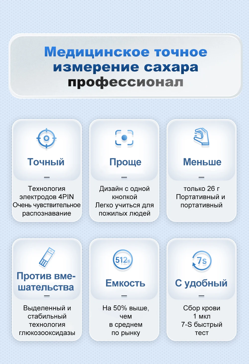 С помощью технологии GOD глюкозы оксидазы улучшена сильная устойчивость к различным веществам тест-полоски интерференции действительны до 24 месяцев