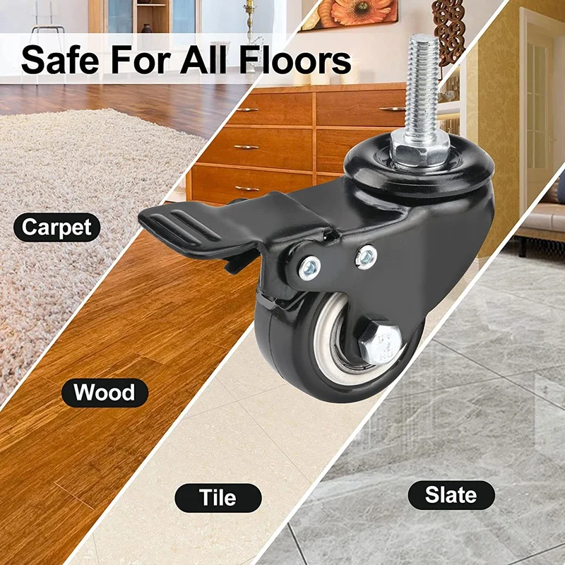 Двойные блокирующие тормоза: безопасные двойные блокирующие тормоза эффективно фиксируют шарнирное соединение и колеса. Встроенные точные шариковые подшипники поддерживают свободное вращение и гладкость качения, прощайтесь с резким шумом. Предназначен для наружных, деревянных полов и ковров.
